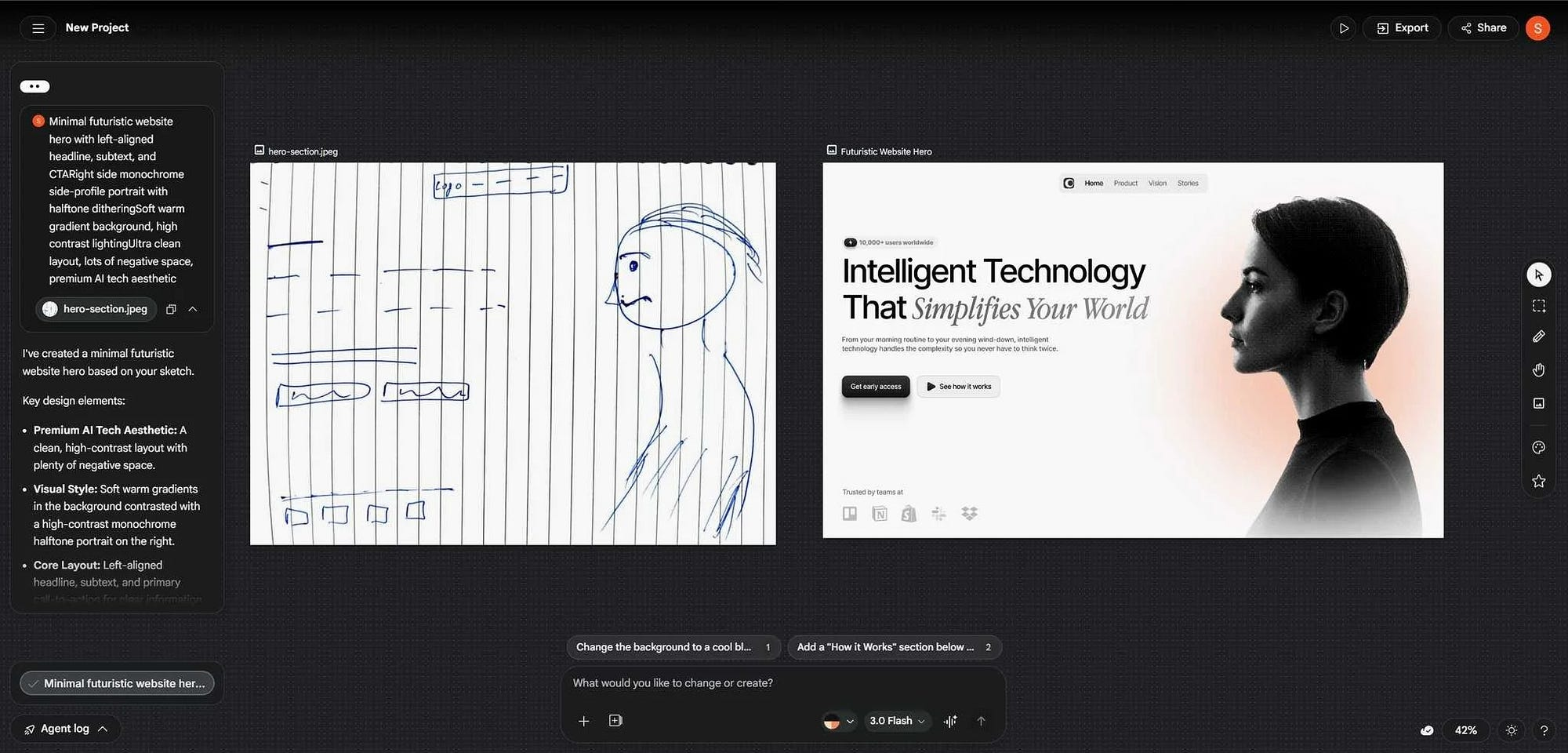 Це, мабуть, найнеочікуваніша функція оновлення. Stitch підтримує голосові команди, і агент може давати дизайн-критику в реальному часі, проєктувати новий лендинг, задаючи уточнювальні питання, і вносити зміни безпосередньо в процесі розмови. Команди на кшталт "дай мені три варіанти меню" або "покажи цей екран у різних кольорових палітрах" виконуються поки дизайнер говорить вголос.