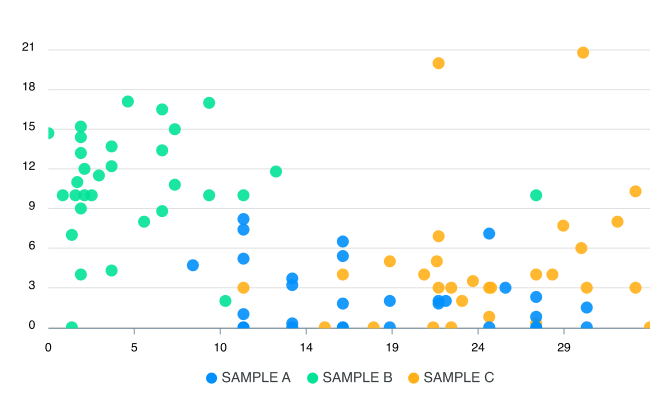 Використовуйте точкові діаграми для пошуку кореляцій чи аномалій, але переходьте на підтипи, якщо даних забагато.