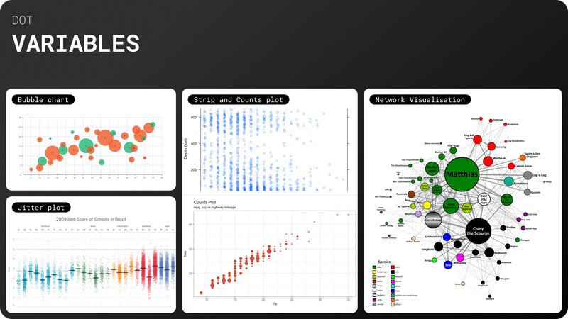 - Карта зв’язків (Network Visualisation): Вузли й лінії показують складні взаємозв’язки, наприклад, у соціальних мережах.