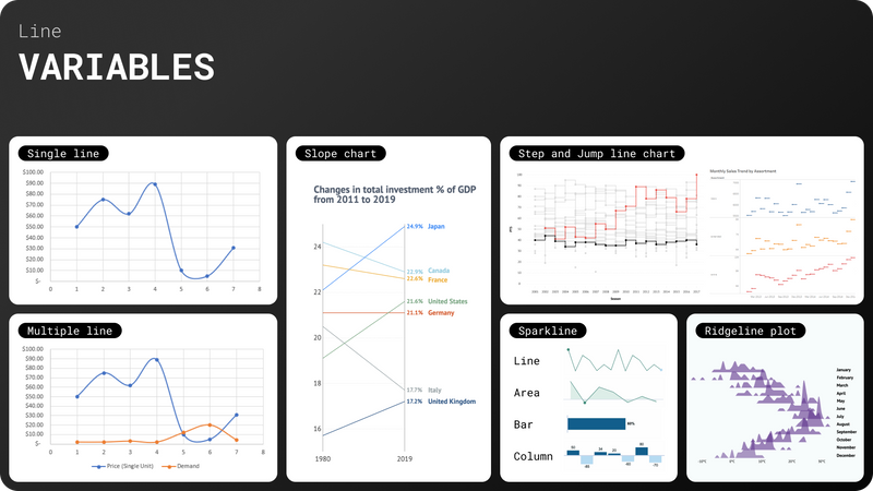 - Мультилайн: Декілька ліній на одному графіку для порівняння (наприклад, доходи різних компаній).