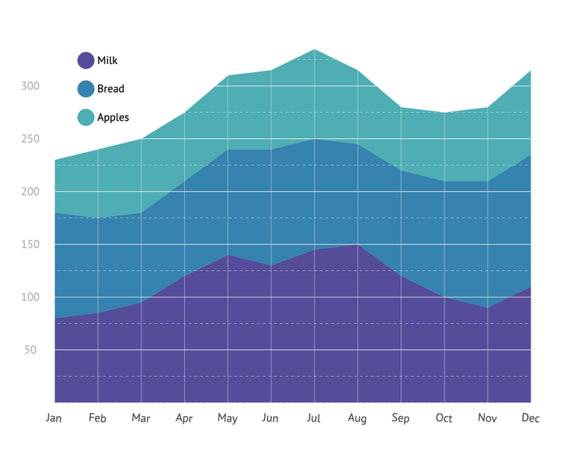 Діаграми площин — це лінійні графіки із заповненою областю, які акцентують величину змін. Вони підходять для показу обсягу, наприклад, сумарного доходу за період.