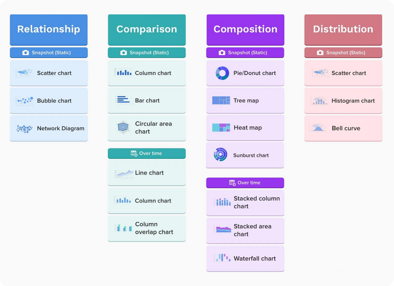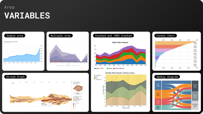 - Потоковий (Stream Graph): Плавні форми для естетичного відображення змін.