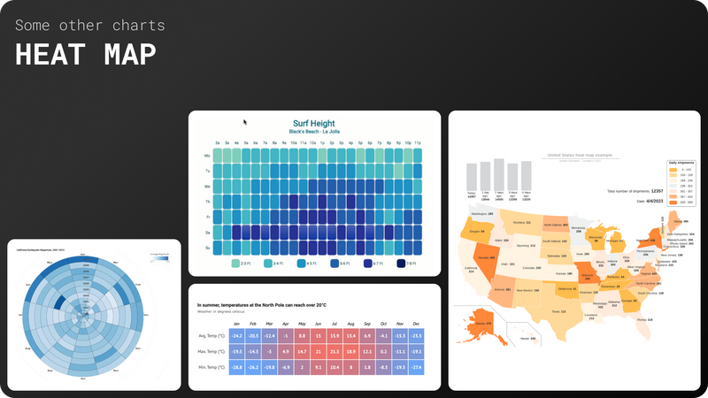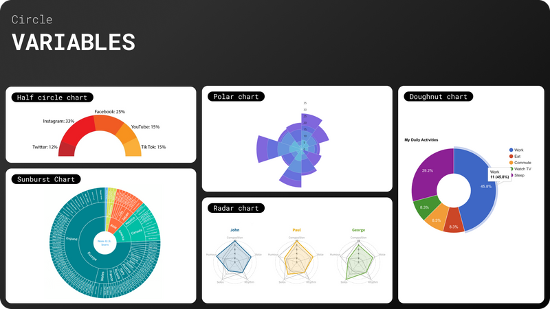 - Радар (Radar Chart): Багатовимірні дані на осях від центру.