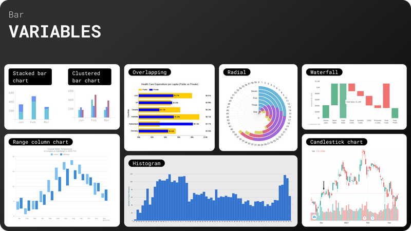 Стовпчикові діаграми — універсальний вибір для порівняння категорій. Вертикальні чи горизонтальні стовпці чітко показують дискретні значення.