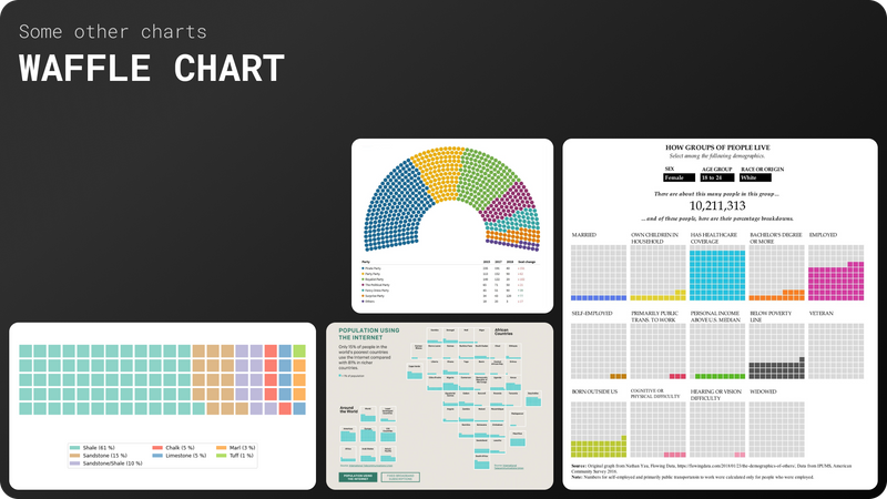 Вафельна діаграма (Waffle Chart): Квадрат 10x10 для пропорцій, легший для сприйняття, ніж кругова.
