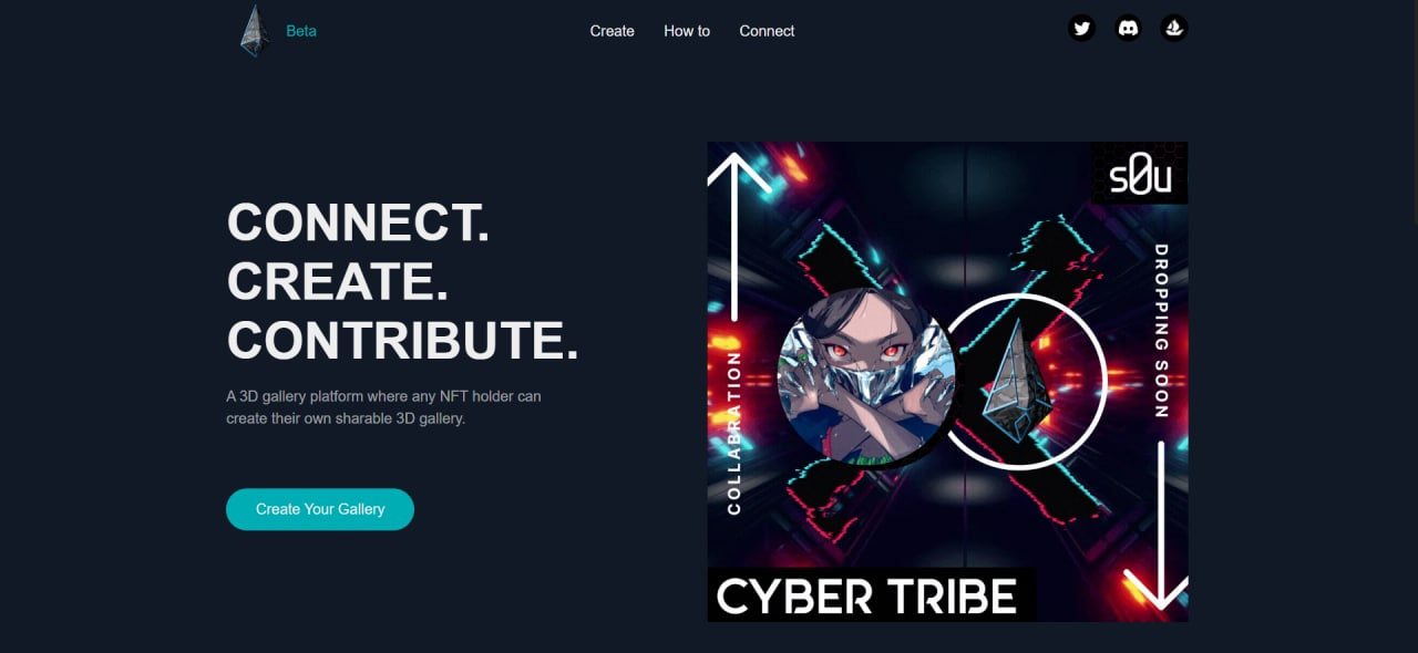 Cybertribe.io - сервіс, що дозволяє легко і швидко створити власну віртуальну 3D-галерею на основі опублікованих NFT. Метавсесвіти, AR-технології, ігри віртуальної реальності - все це стало частиною нашого повсякдення і з кожним днем поширюється серед загалу. Тож такий сучасний метод демонстрації продукту точно покаже відповідальний та серйозний підхід до роботи та точно виділить вас серед натовпу, справить незабутнє враження на інших артистів або потенційних покупців ваших NFT-артів.