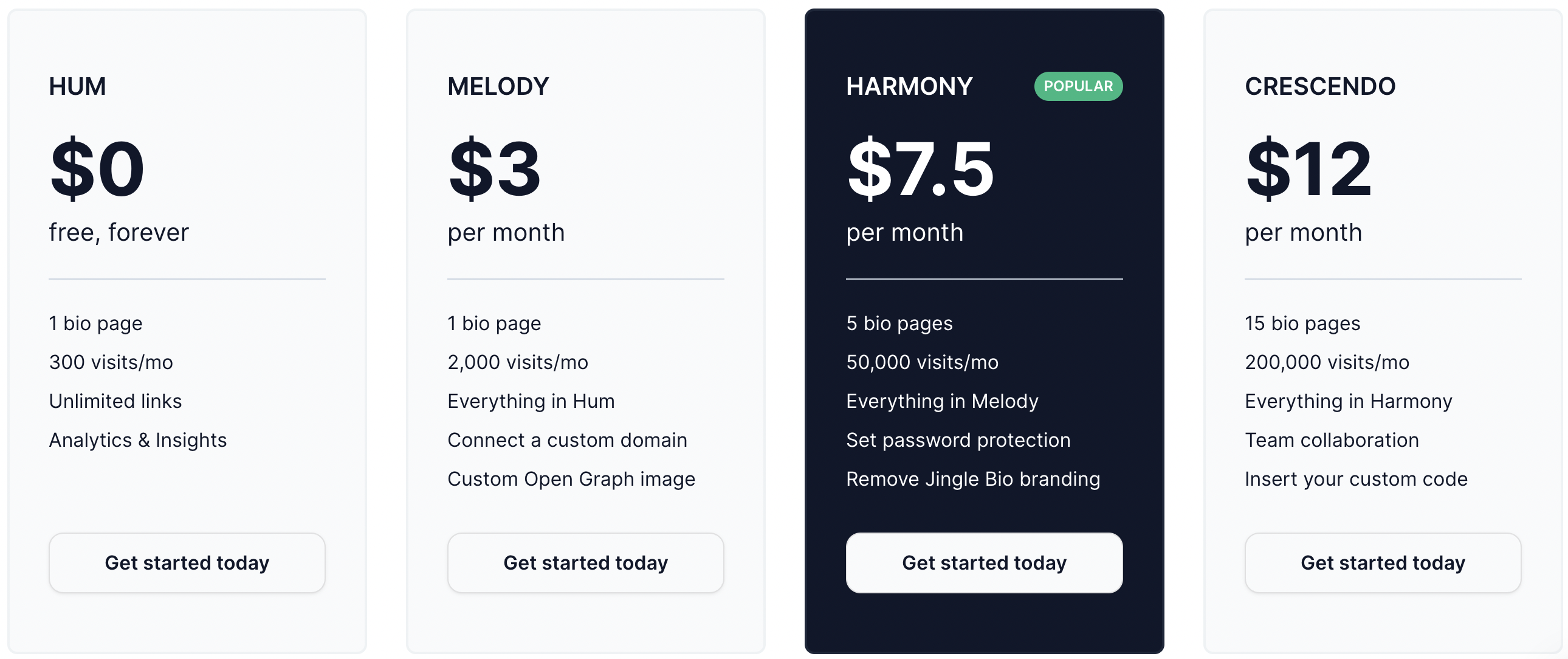 Jingle Bio має всього 4 тарифні плани: Hum, Melody, Harmony, Crescendo.