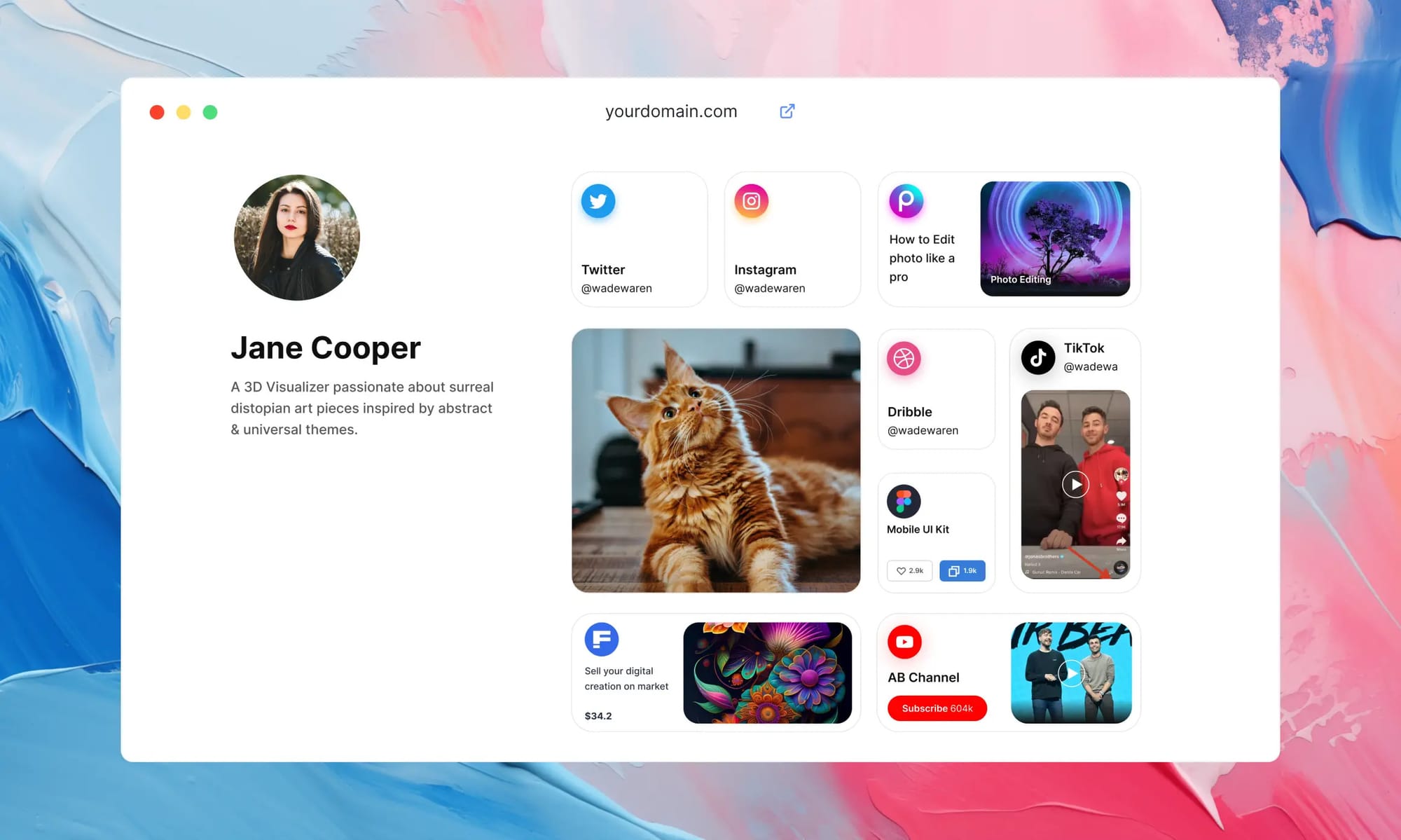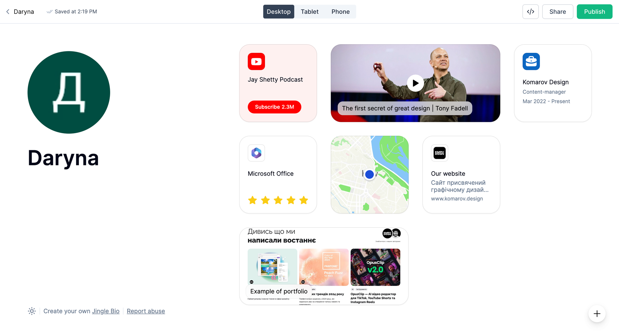 Jingle Bio — це інтерактивна платформа для створення міні-сайтів візитівок на основі даних про ваші навички та досвід роботи. Окрім цього, інструмент вбудовує колекції посилань з гарними прев’ю, дозволяє додати геолокацію, віджети та медіафайли. Завдяки зручному інтерфейсу користувачі можуть створити компактну, візуально привабливу дошку з необхідною інформацією, активними посиланнями, поділитись своїми роботами та досвідом. Візитівку можна оформити у своєму стилі, інтегрувати потрібні віджети та поділитись посиланням з клієнтами або колегами.