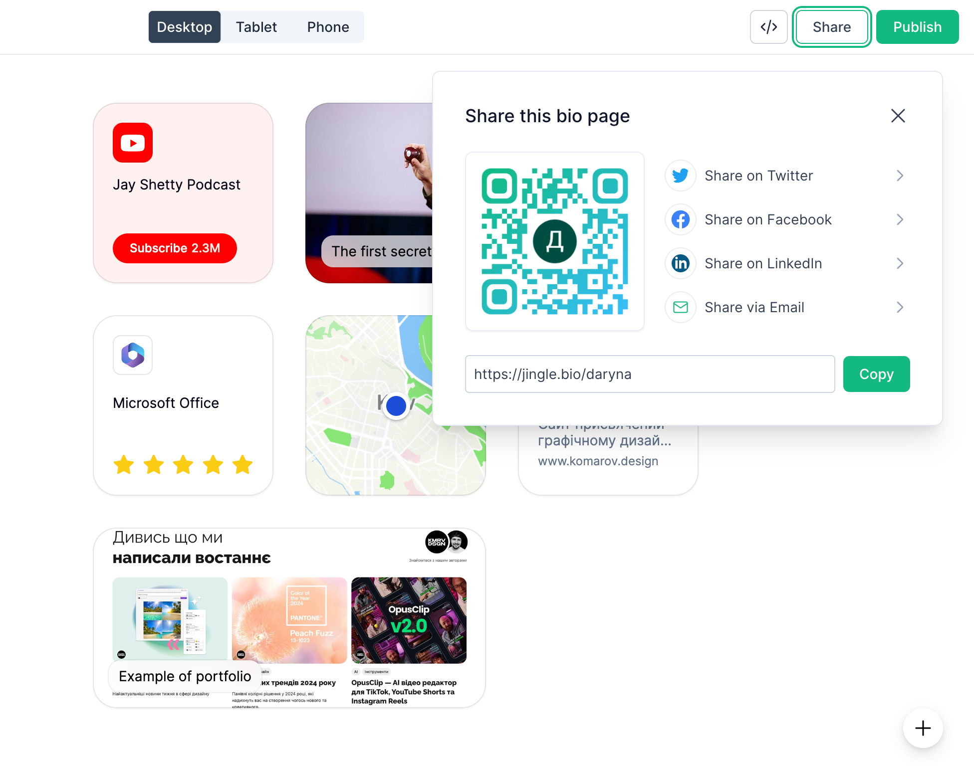 Коли все готово опублікуйте вашу візитку за допомогою кнопки “Publish” та тисніть “Share”, щоб отримати посилання та поділитись ним з колегами або клієнтами. Також можна відправити запрошення у соціальні мережі чи поділитись QR-кодом.