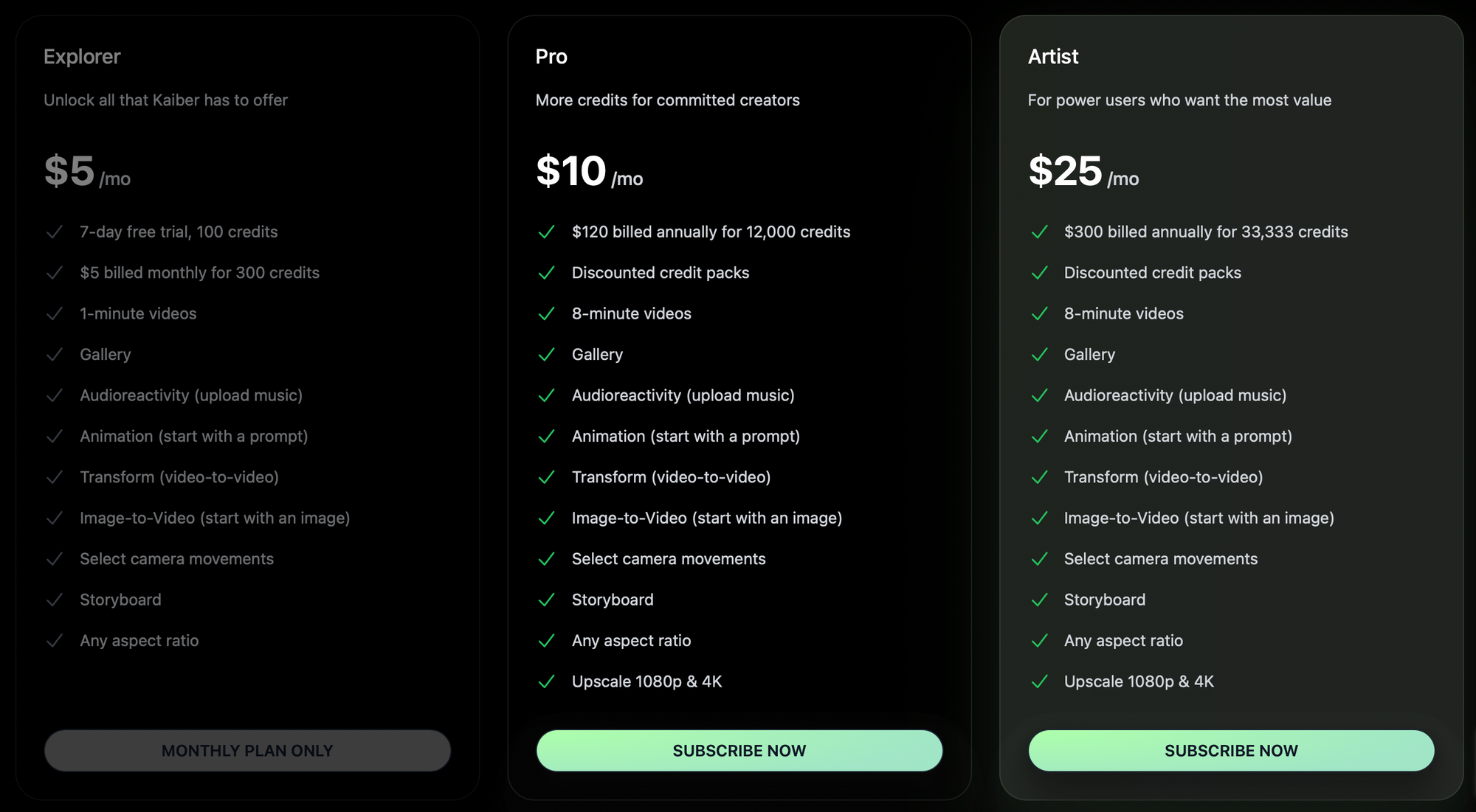 Kaiber має всього 3 тарифні плани: Explorer, Pro, Artist.