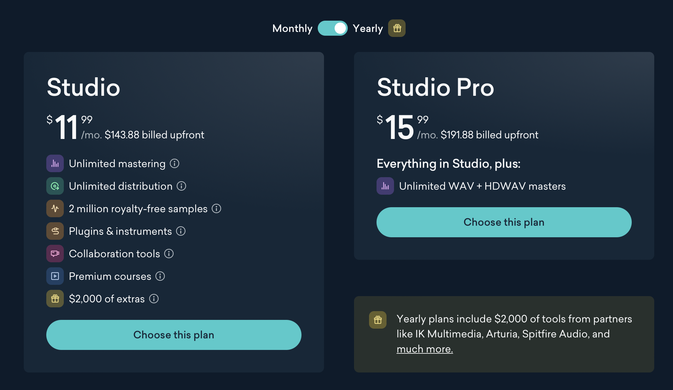 LANDR має два тарифні плани: Studio та Studio Pro. План Studio включає безлімітні можливості мастерингу та розповсюдження треків, доступ до 2 мільйонів зразків, аудіо фрагментів, а також плагінів. Окрім цього, ви отримуєте доступ до курсів та функцій співпраці. За $11.99 ви отримуєте доступ до всіх функцій інструменту. План Studio Pro включає ті самі функції та додатково до всього пропонує безлімітний мастеринг WAV та HDWAV файлів за $15.99 на місяць.