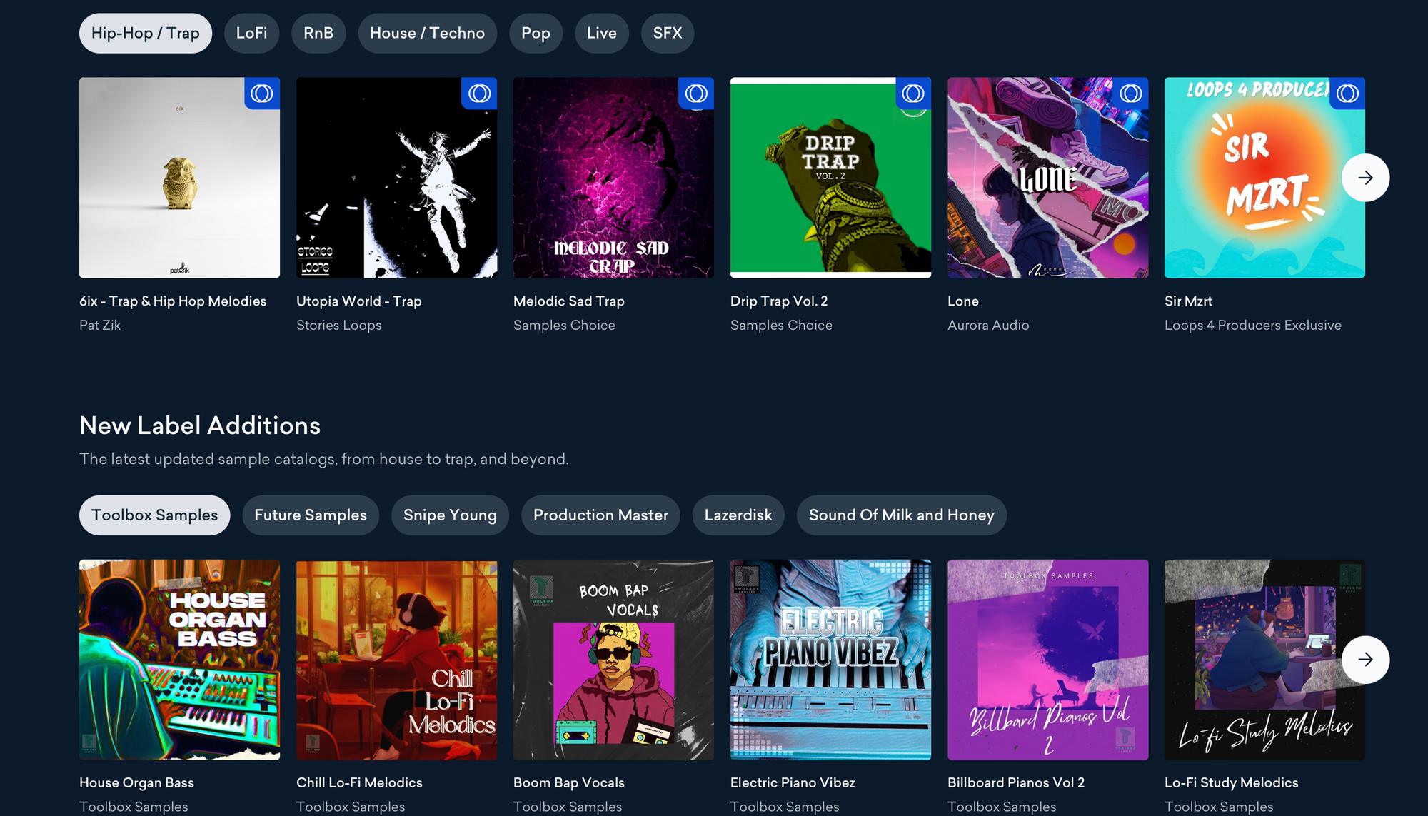 LANDR надає купу безкоштовних зразків звуків та музики у різних жанрах та від різних виконавців. Музиканти можуть переглядати та використовувати ці зразки для накладення у свої аудіо. Усі звуки у зразках є високоякісними 24-бітними/44,1 кГц стерео WAV-файлами та працюють, які працюють з будь-якою DAW. Бібліотека регулярно оновлюється новим вмістом, надаючи доступ до оновлених звуків та циклів.