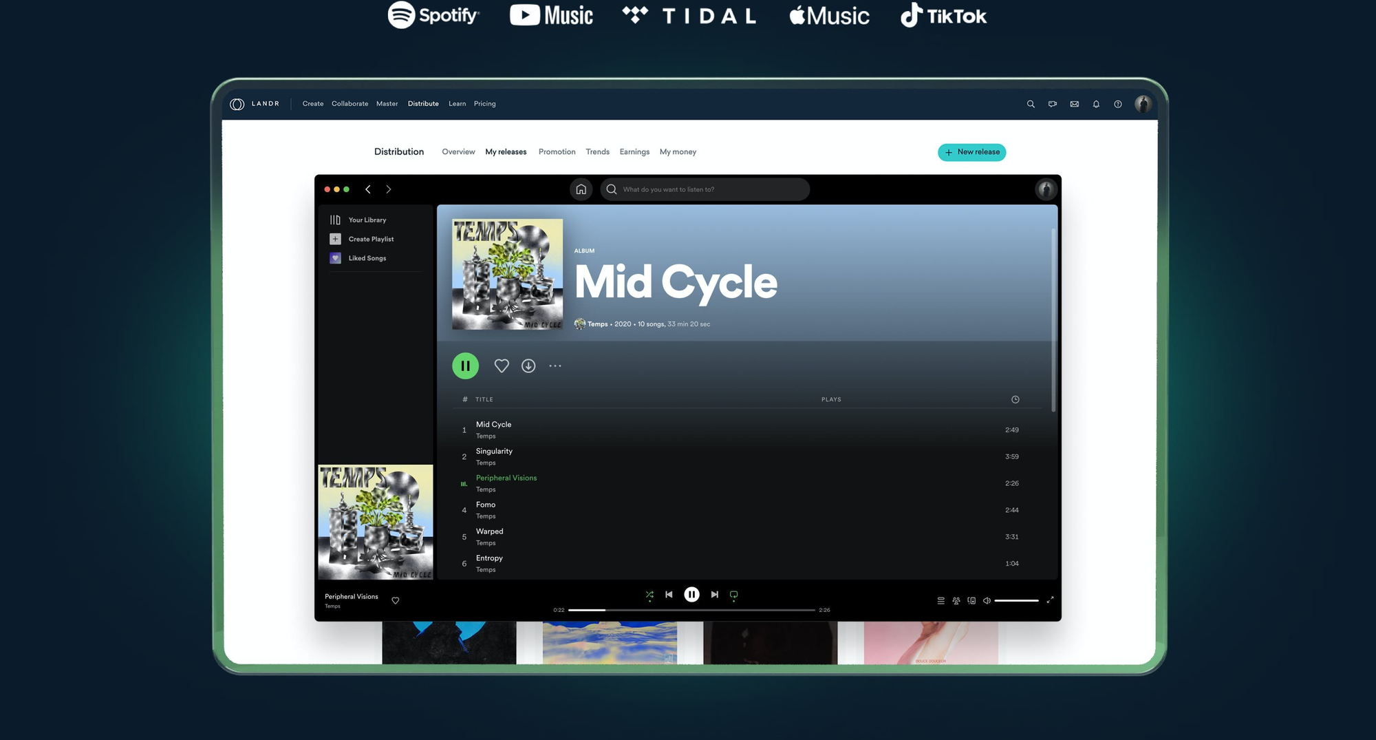 Окрім мастерингу, LANDR надає послуги з розповсюдження музики, що дозволяє користувачам випускати та монетизувати свою музику на різних цифрових потокових платформах. Таким чином ви розширюєте охоплення та отримуєте прибуток від своєї музики.
