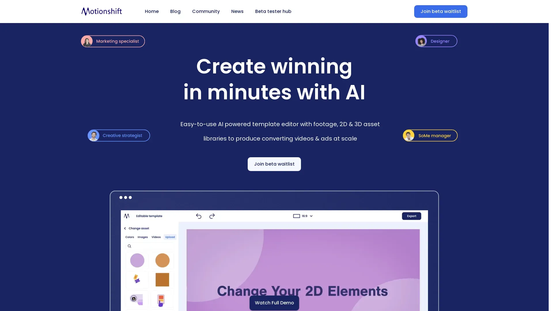 Motionshift — це інструмент на основі штучного інтелекту, який дозволяє створювати високоякісні 2D- і 3D-відео за допомогою інтуїтивно зрозумілого редактора та готових, попередньо анімованих, шаблонів. Для користування не потрібно мати дизайнерські навички. Вільно розміщайте та міняйте місцями об’єкти, додавайте текст та інші налаштовувальні елементи. Motionshift також має вбудовану бібліотеку, яка пропонує доступ до понад 100 000 безкоштовних відео високої якості, 1000+ 3D-моделей, 100+ анімованих шрифтів і величезну колекцію музики без авторських прав.