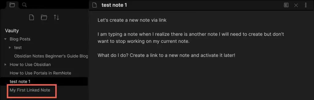 Другий спосіб за допомогою посилання може заощадити ваш час під час роботи в Obsidian. По суті, ви можете створити посилання на нотатку, якої ще не існує. Це зручно, коли ви працюєте над нотаткою і знаєте, що вам потрібно буде створити ще одну, але не хочете заповнювати її відразу. Ви можете просто створити нове посилання з назвою, яку хочете призначити новій нотатці.