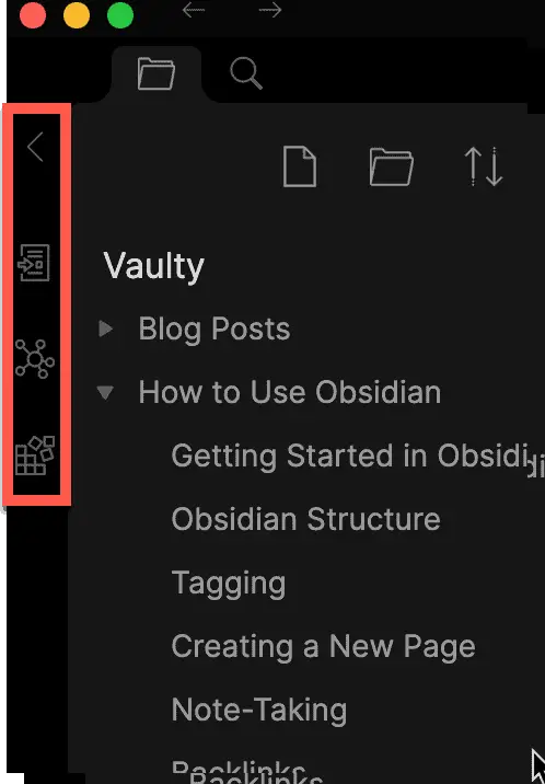 - Бічна панель: ліва бічна панель відображає зворотні посилання та незв’язані посилання. Незв’язані посилання можна зв’язати одним кліком миші. Він також використовується плагінами для відображення контуру ваших заголовків, панелі тегів тощо.