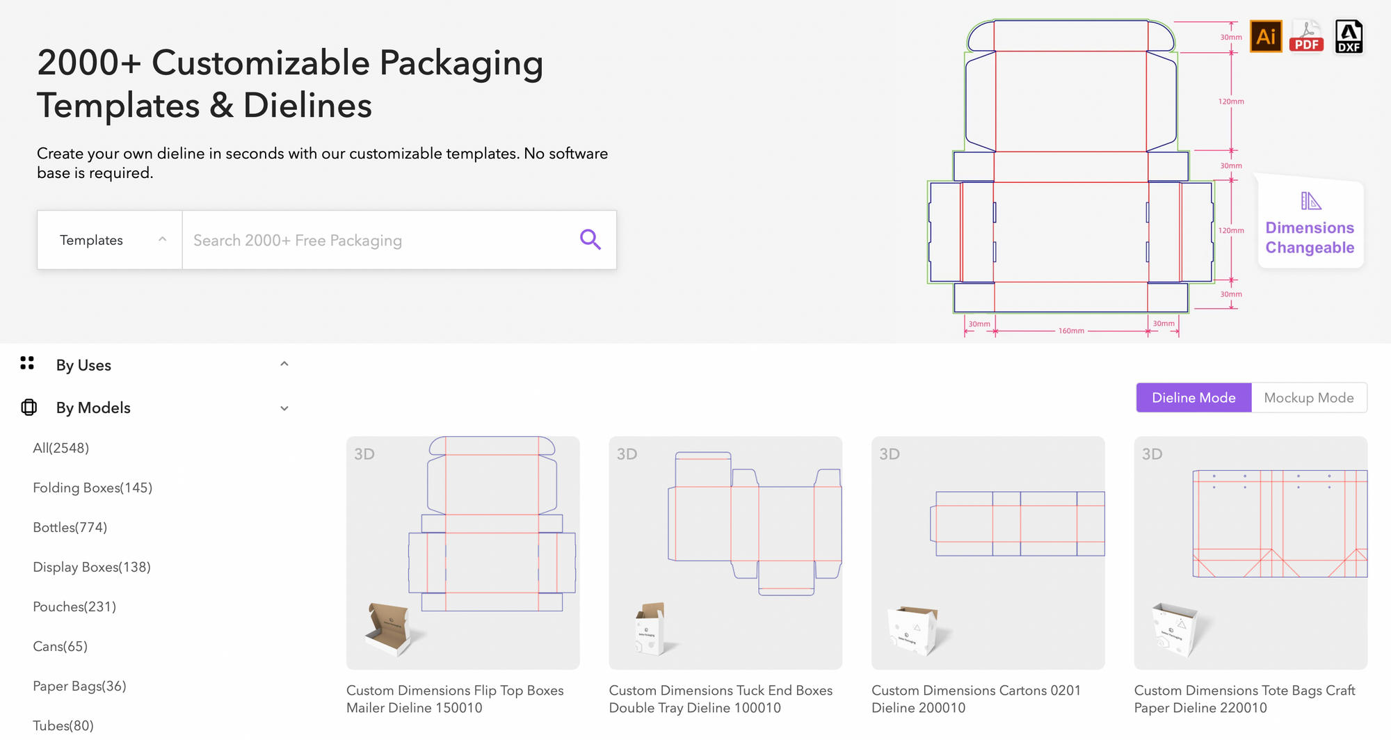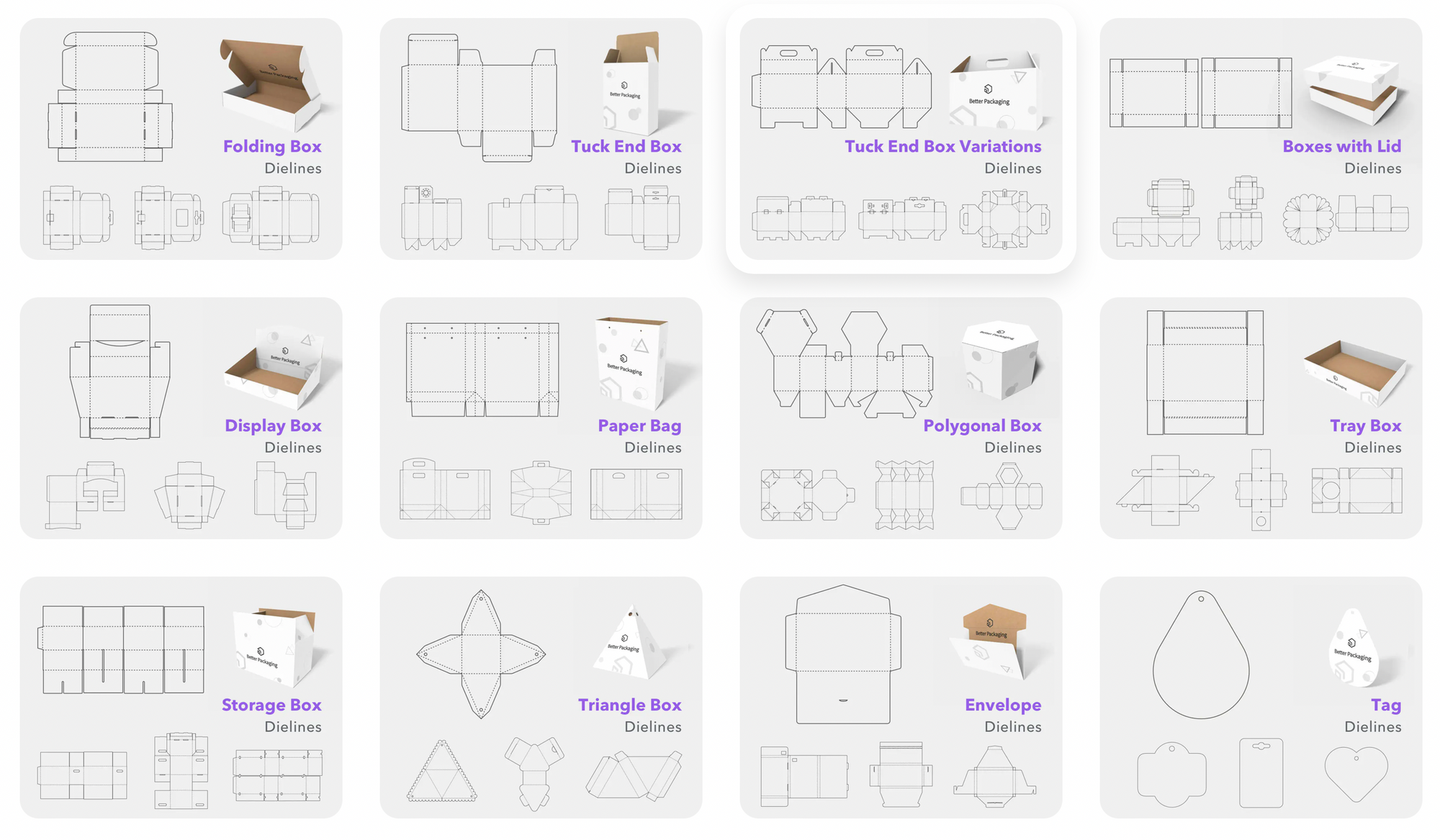 - Різноманітний вибір шаблонів: платформа пропонує широкий вибір шаблонів і макетів для різних типів пакування, включаючи коробки, пляшки, пакети, чашки, банки, трубки, ящики, конверти, одяг тощо.