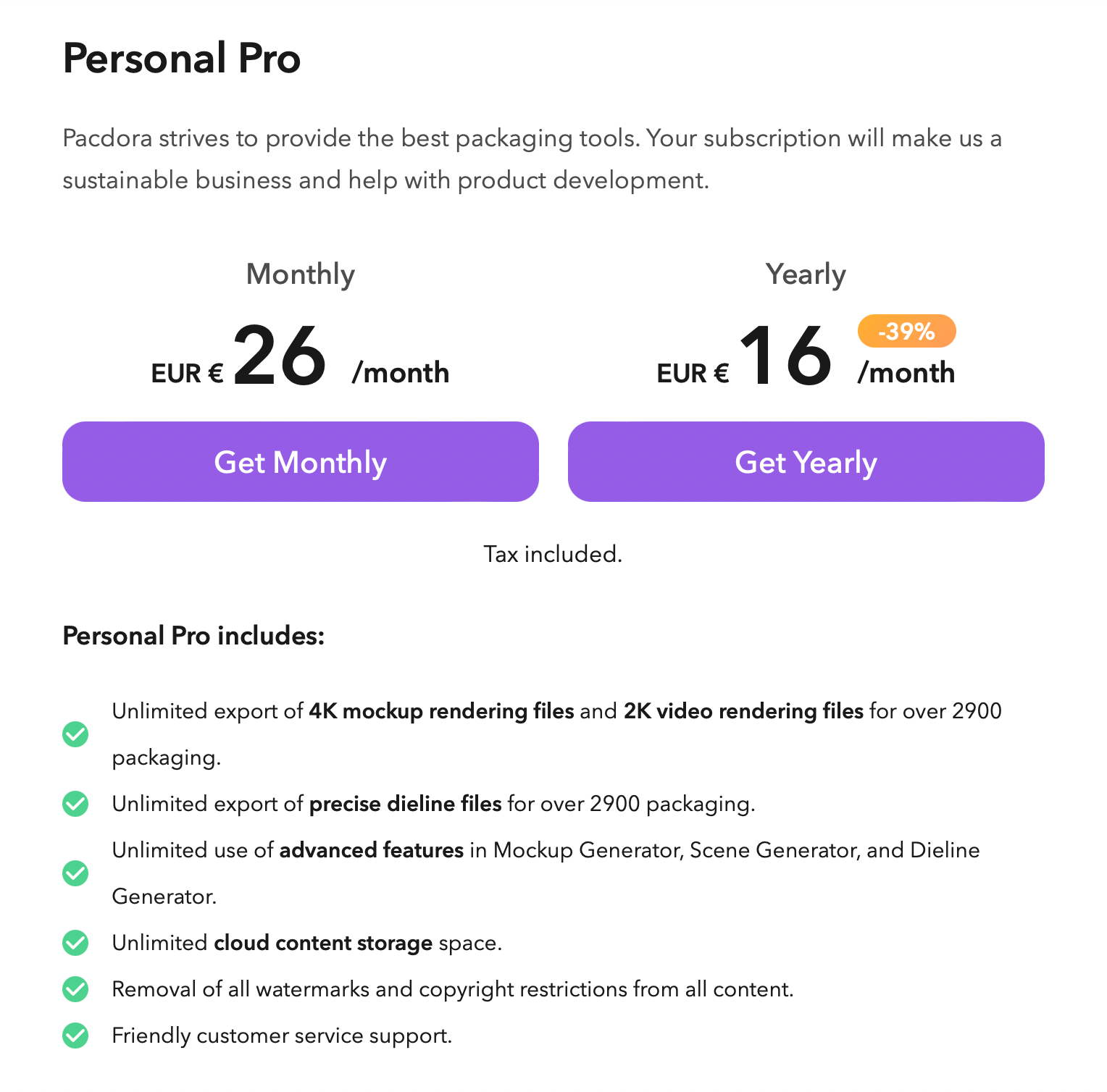 Pacdora пропонує один, платний Personal Pro план, який включає: