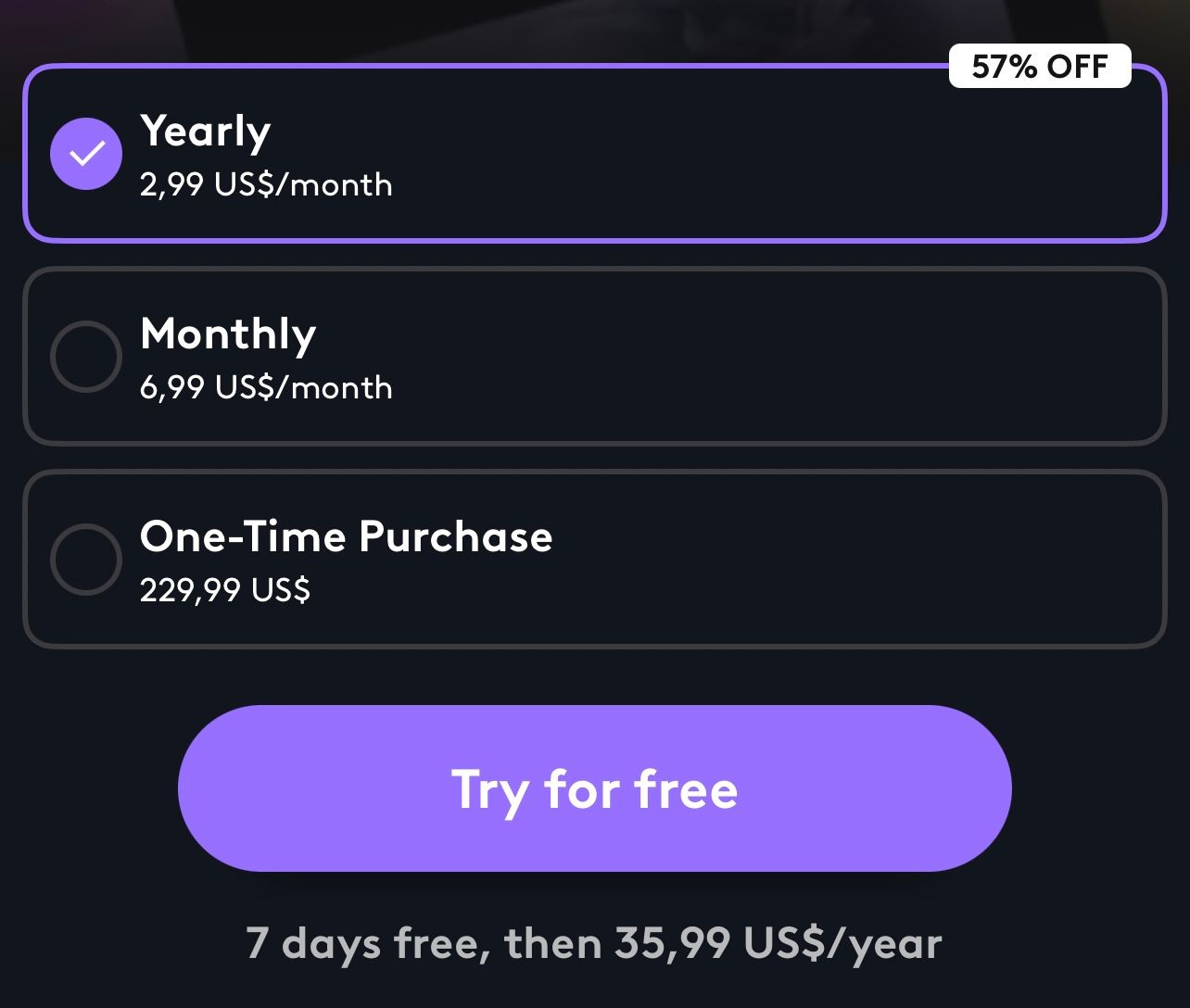 Photoleap має всього три тарифні плани: річний, місячний, а також одноразова покупка додатка. При покупці будь-якого з тарифів ви отримуєте доступ до всіх інструментів. Єдина різниця це тривалість та вартість підписки. Місячний план коштуватиме вам $6.99 на місяць, річний, $2.99 на місяць. Вартість одноразової покупки складе $229.99.