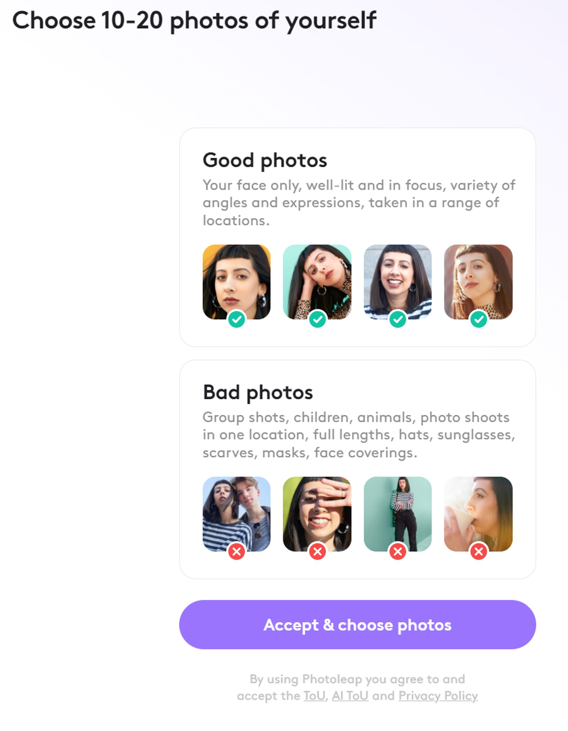 Після успішного входу до програми оберіть кнопку або розділ "AI-аватари".Погодьтеся з умовами користування, натиснувши кнопку "Прийняти". Далі вам буде потрібно вибрати фотографії, які будуть використовуватися для створення AI-аватара. Рекомендується зробити 10-20 фотографій для кращих результатів. Після вибору фотографій Photoleap проведе аналіз зображень і створить для вас унікального AI-аватара, використовуючи розпізнавання обличчя та інші технології штучного інтелекту.