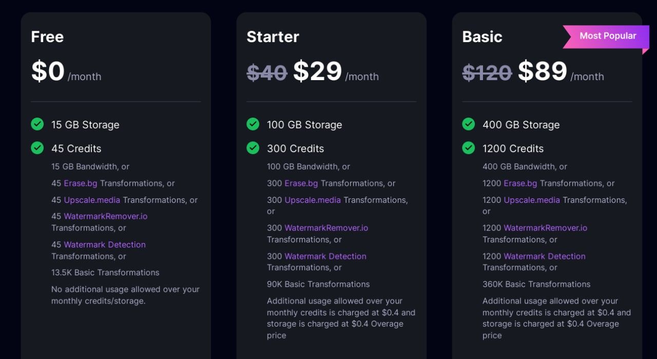 Всього в PixelBin є 4 тарифи: безкоштовний, початковий, базовий та преміум. Обирати слід виходячи виключно зі своїх потреб. Нижче детально описана кількість використання або можливість використання того чи іншого інструмента. Також дуже круто, що безкоштовний тариф є досить розширеним. Ви дійсно зможете якісно протестувати платформу та прийняти остаточне рішення.
