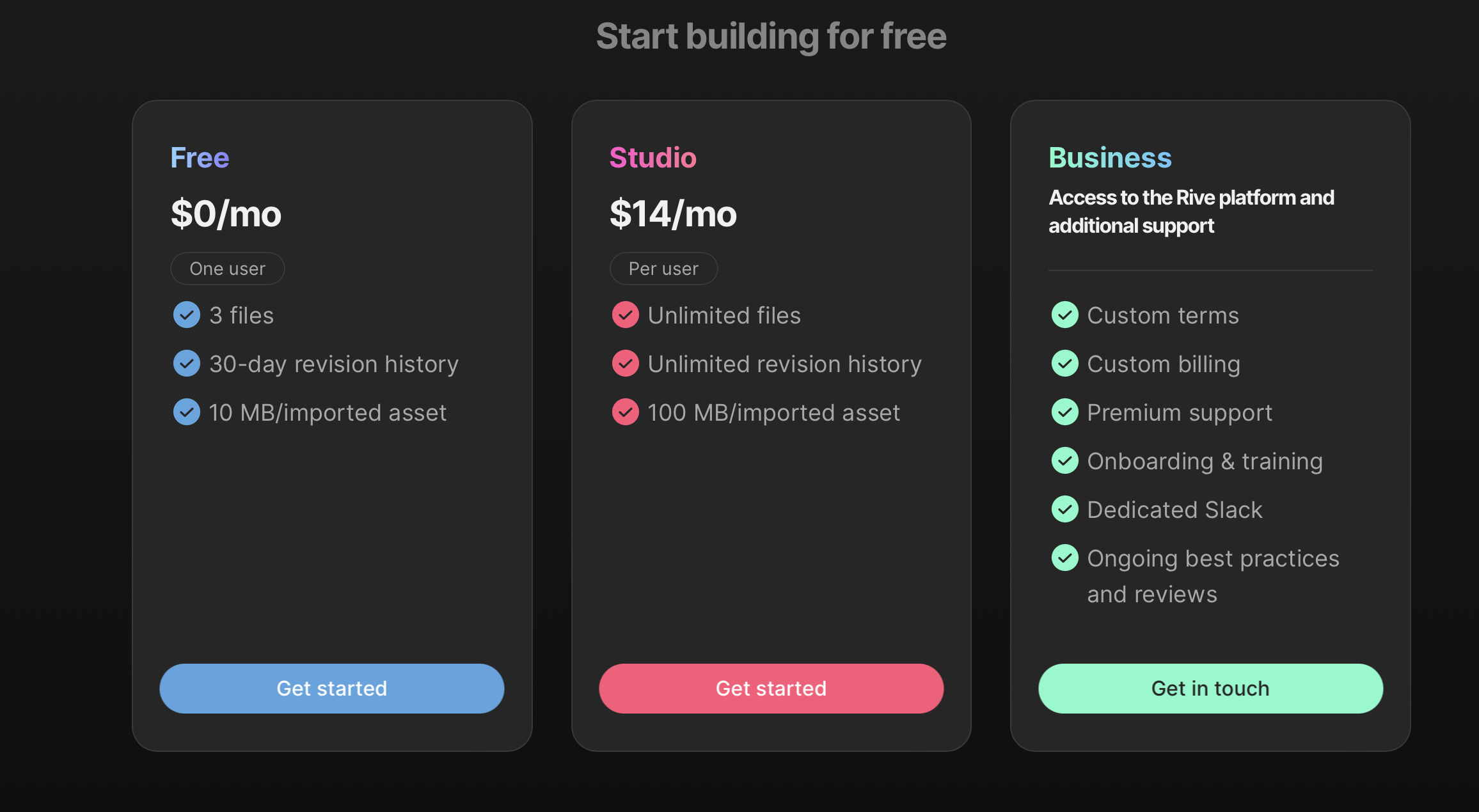 Rive пропонує три тарифні плани: Free, Studio та Business.