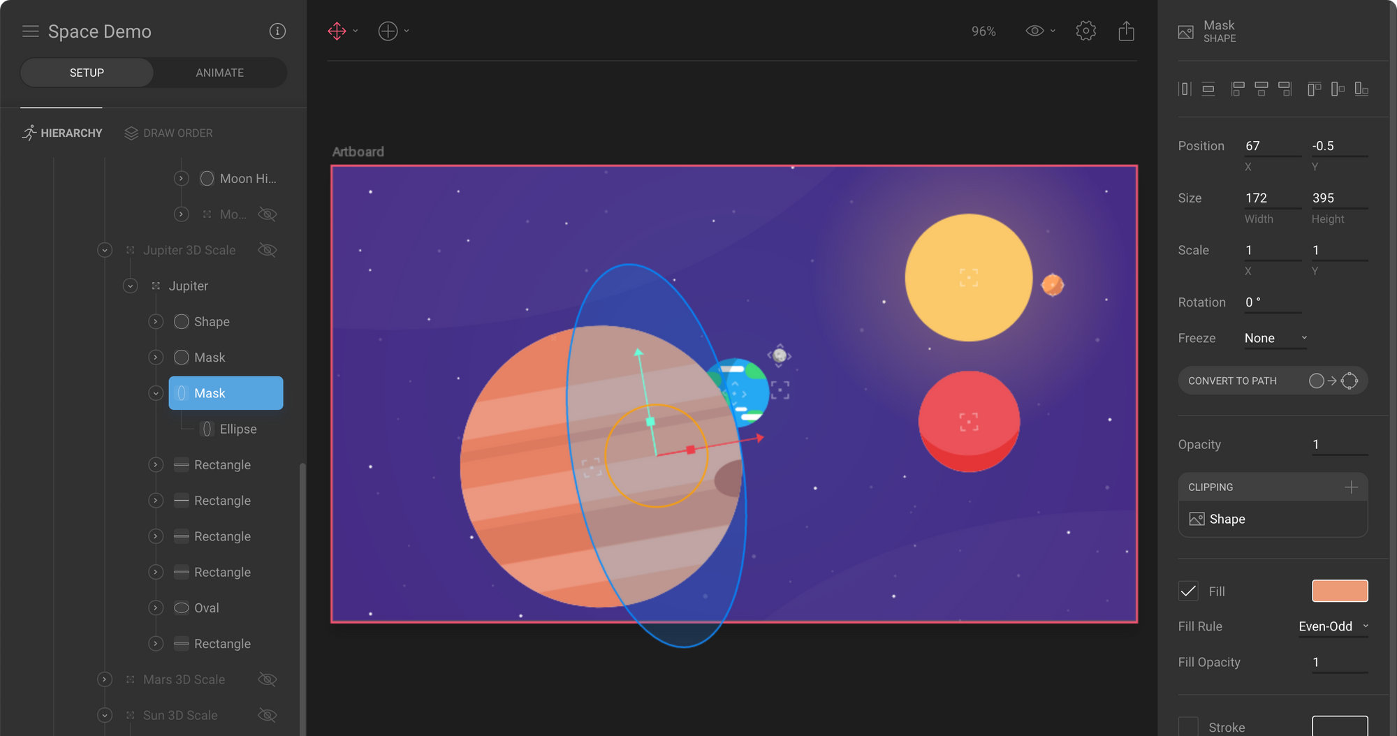 Анімація. Rive має великий вибір інструментів для створення анімацій, включаючи можливість створювати складні та унікальні анімації використовуючи принципи анімації, такі як таймінг, ефекти переміщення тощо.