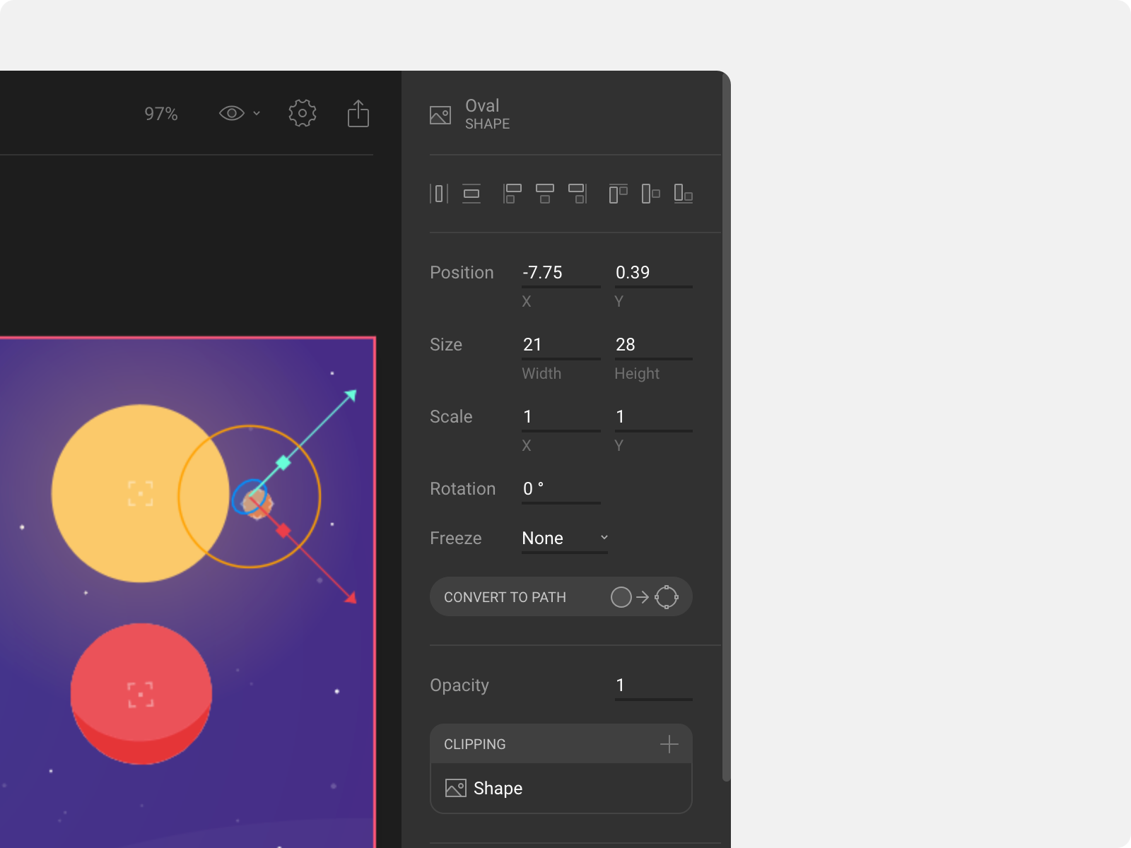 Створення анімації. Щоб створити анімацію, оберіть "Animator" з панелі інструментів. Потім створіть новий аніматор і додайте ключові кадри, які визначатимуть позицію, розмір та інші параметри ваших векторних об'єктів у різні моменти часу. Можна створити принципи анімації, такі як таймінг, ефекти переміщення та ін., щоб створити цікаві та живі зображення.