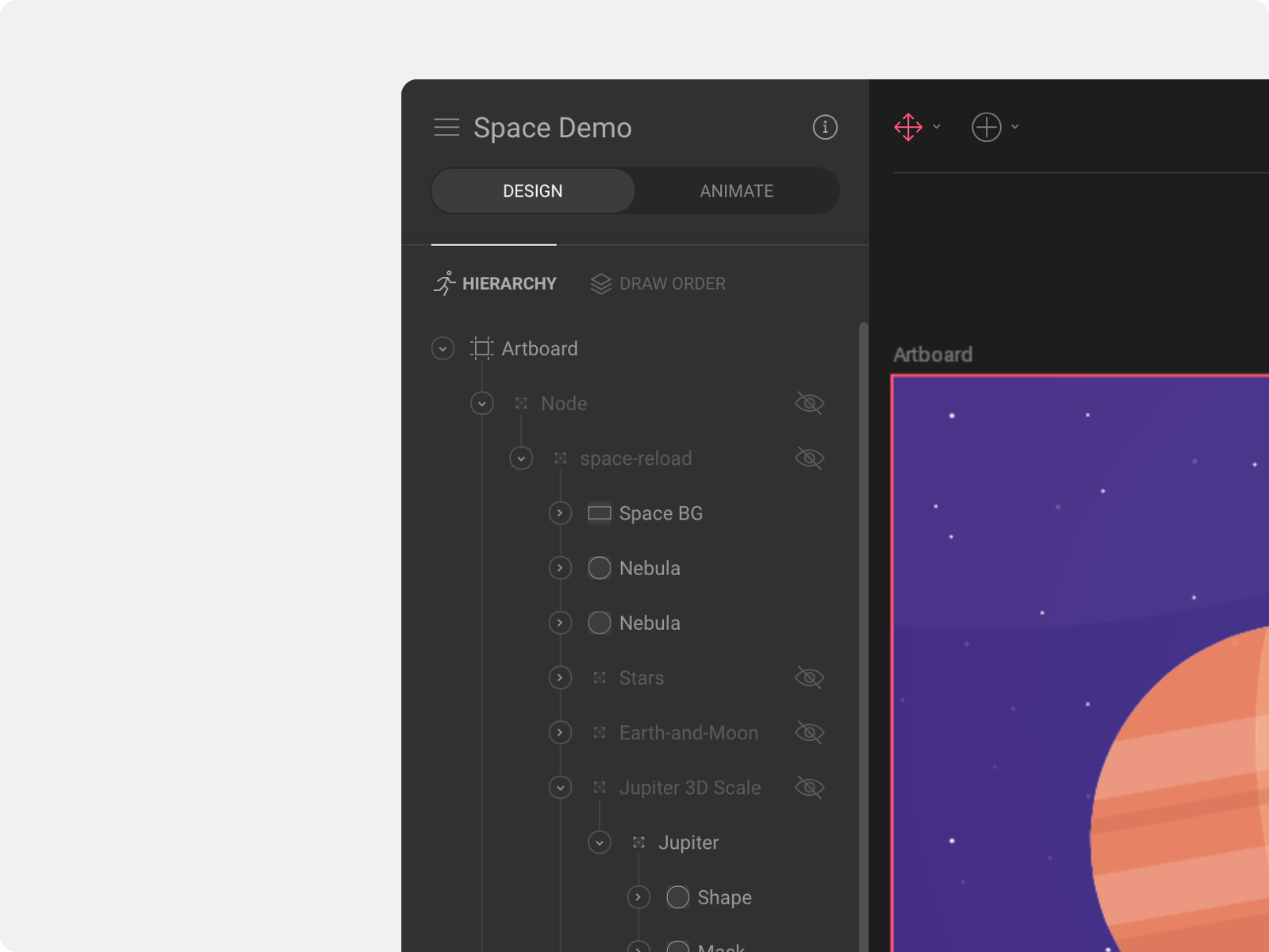 Робота в команді. За допомогою Rive ви можете вільно працювати над розробкою графіки та анімації в команді та режимі реального часу, обмінюючись необхідними файлами, що робить його незамінним інструментом в колективному процесі розробки.