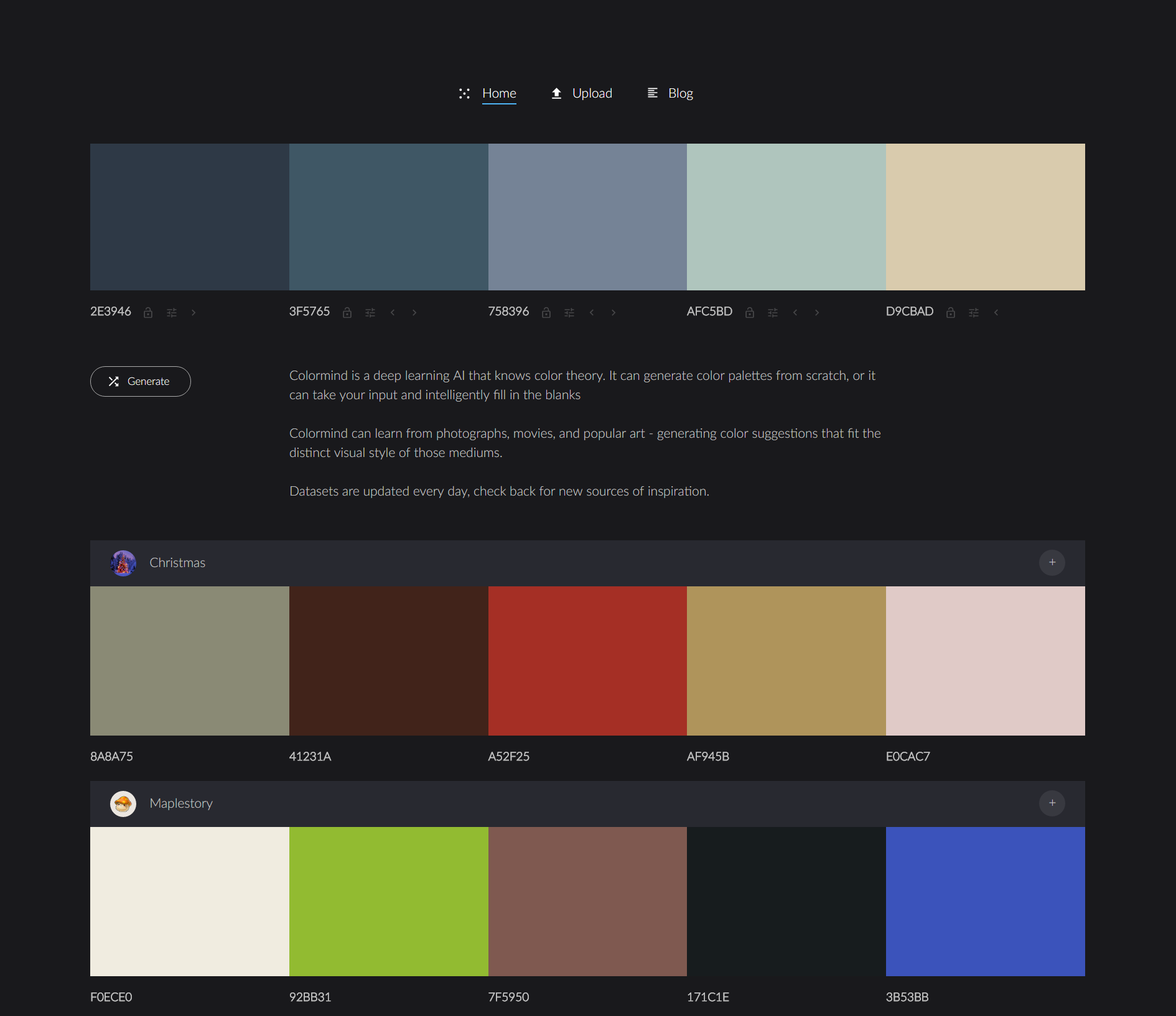 Colormind.io — це інструмент на основі штучного інтелекту для створення кольорових палітр. Ця інноваційна платформа використовує алгоритми глибокого навчання, щоб аналізувати мільйони комбінацій кольорів і пропонувати найкращі відповідності на основі ваших уподобань. Платформа згенерує палітри для будь-якого типу проєкту: вебсайту, брендингу, мобільного додатку чи будь-якого іншого дизайнерського проєкту.