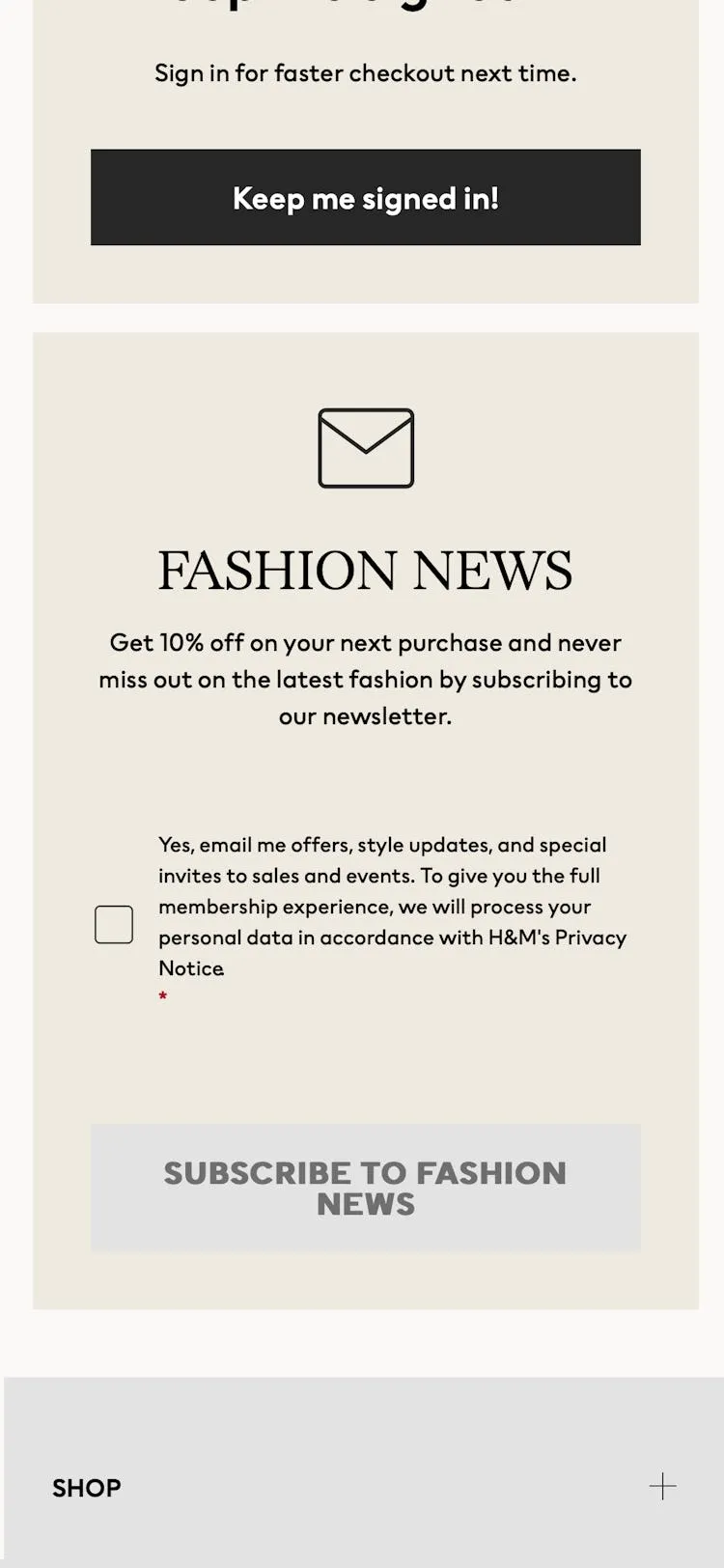 Немає необхідності відволікати користувачів пропозицією підписатися на розсилку під час оформлення замовлення. Краще звернутися до них із цим питанням на сторінці підтвердження вже після завершення покупки. Реалізація може бути дуже простою: посилання або кнопка "Підписатися".
