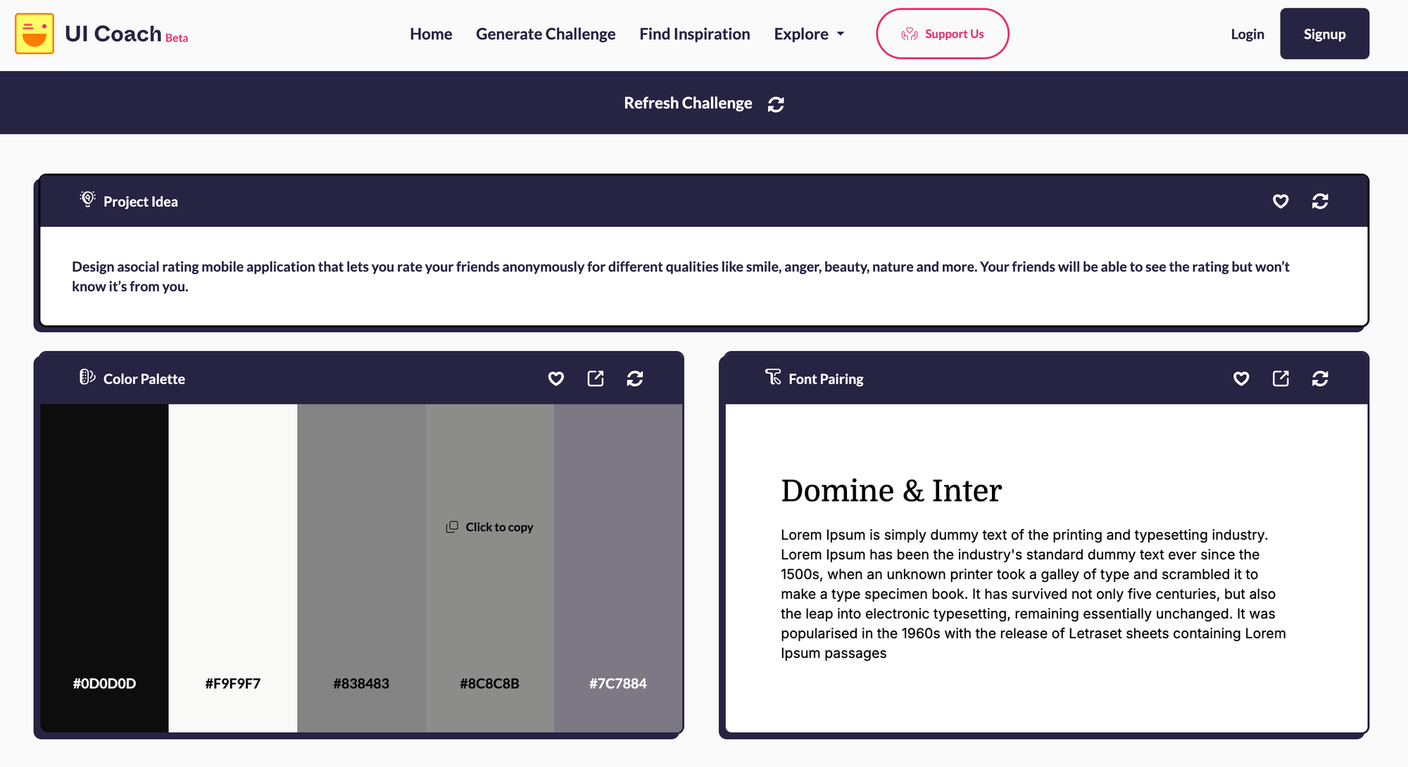 Generate Challenge — генератор для тих, хто любить креативні виклики й хоче попрацювати з обмеженнями. Він видає випадкову тему (наприклад, “Дизайн пакування кави”), а разом із нею — колірну палітру та шрифти, які потрібно використати. Можна окремо перегенерувати палітру чи шрифт, якщо вони не пасують, а іноді нестандартне поєднання теми й кольорів стає додатковим челенджем для створення чогось оригінального.