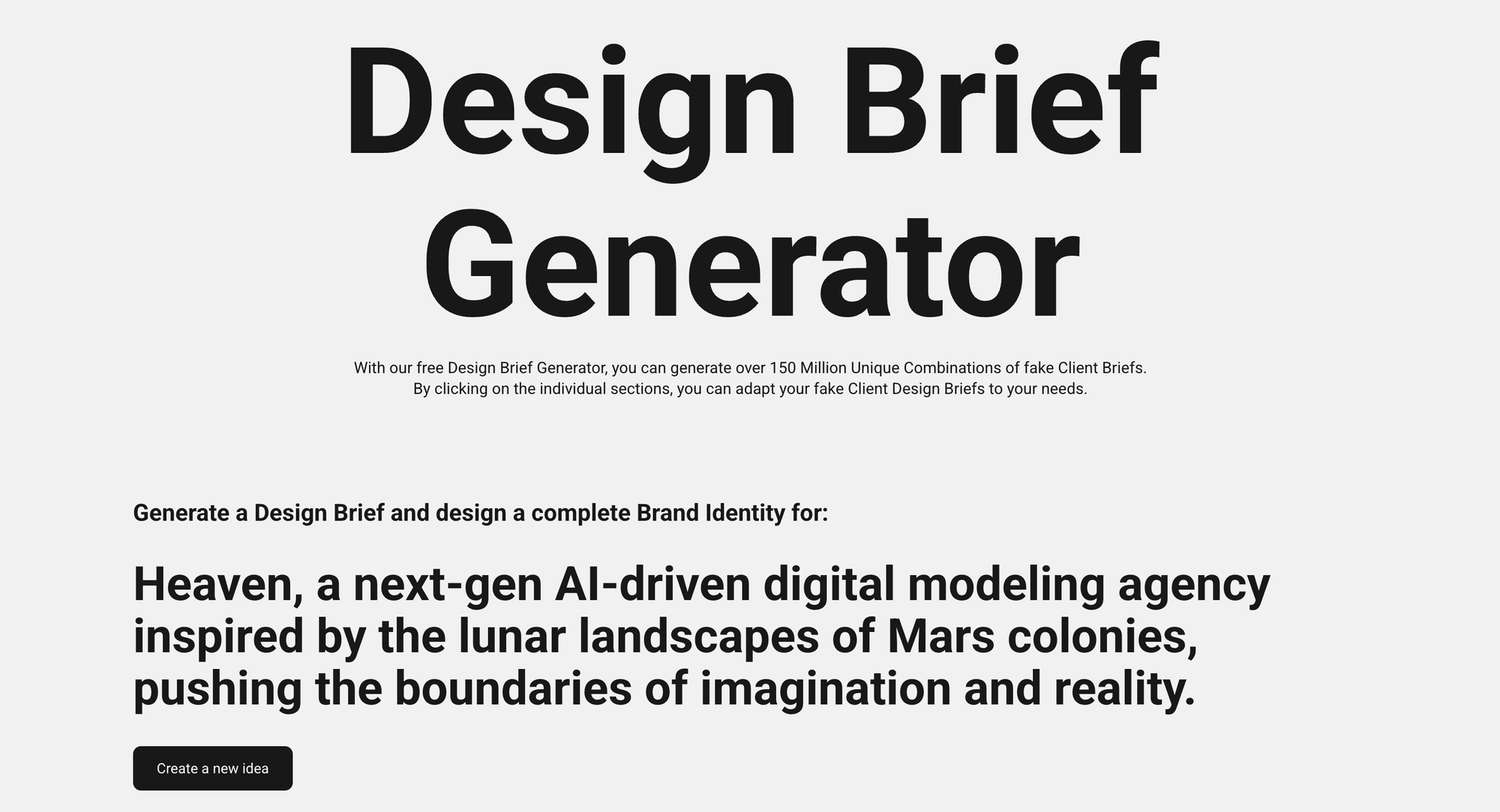 Design Brief Generator — це простенький генератор для тих, хто цінує мінімалізм і гнучкість. Одним кліком він генерує бриф, наприклад, “Дизайн айдентики для екологічного бренду”, а особливість у тому, що кожну частину речення можна перегенерувати окремо, просто навівши курсор і клікнувши. Це дозволяє швидко адаптувати ідею під себе.