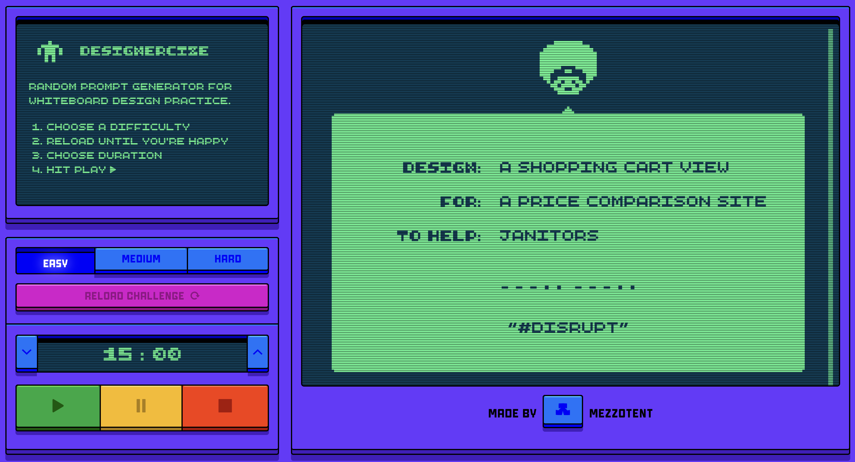 Designercize — інструмент для дизайнерів, які хочуть потренувати не тільки дизайнерські навички, а й тайм-менеджмент. Сервіс пропонує завдання різного рівня складності (від легких до складних), наприклад, “Переробити інтерфейс кошика для магазину”, і дозволяє встановити таймер для цього завдання, від 5 хвилин до години. Особливість додатку у його гейміфікації й випадковій генерації.