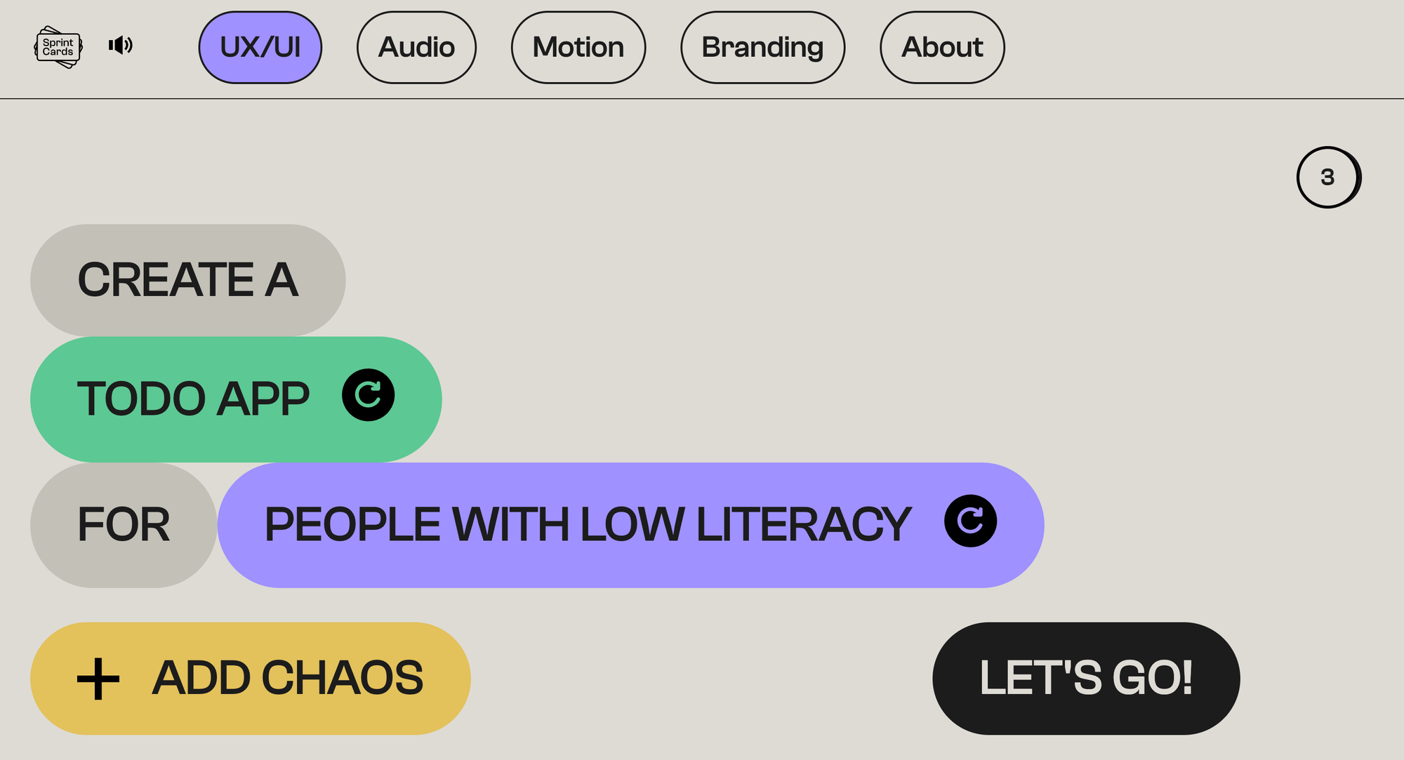 Sprint Cards — генератор нестандартних ідей в категоріях motion чи аудіо (наприклад, “Створити звуковий ефект для гри”), а опція “Add chaos” додає випадковий параметр, типу “у стилі кіберпанку”.