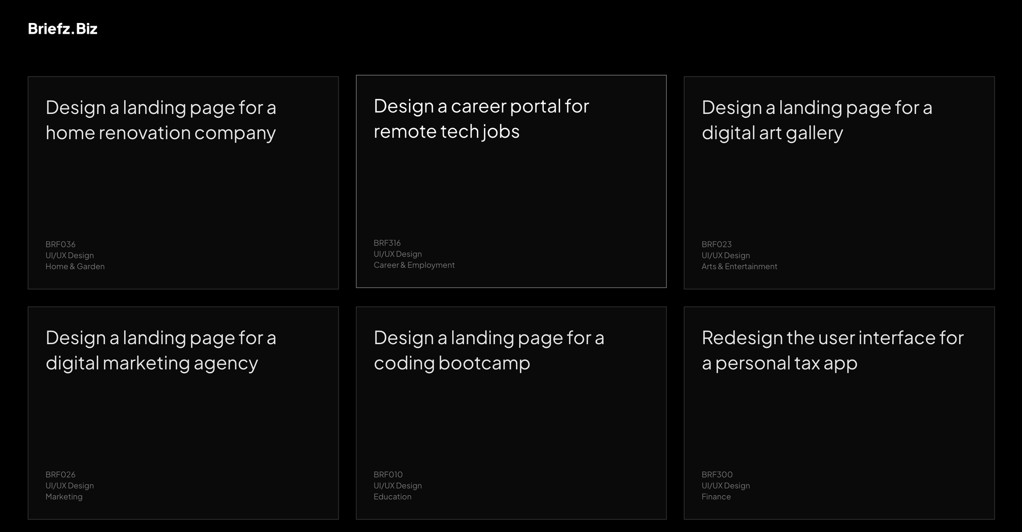 Brief.Biz — це генератор із мінімалістичним дизайном для старту тестового проєкту. Одним кліком він видає різноманітні тематичні брифи — від “Логотип для пекарні” до “UX/UI для додатка доставки”, а додаткова функціональність дозволяє переглянути готові ідеї в категоріях.