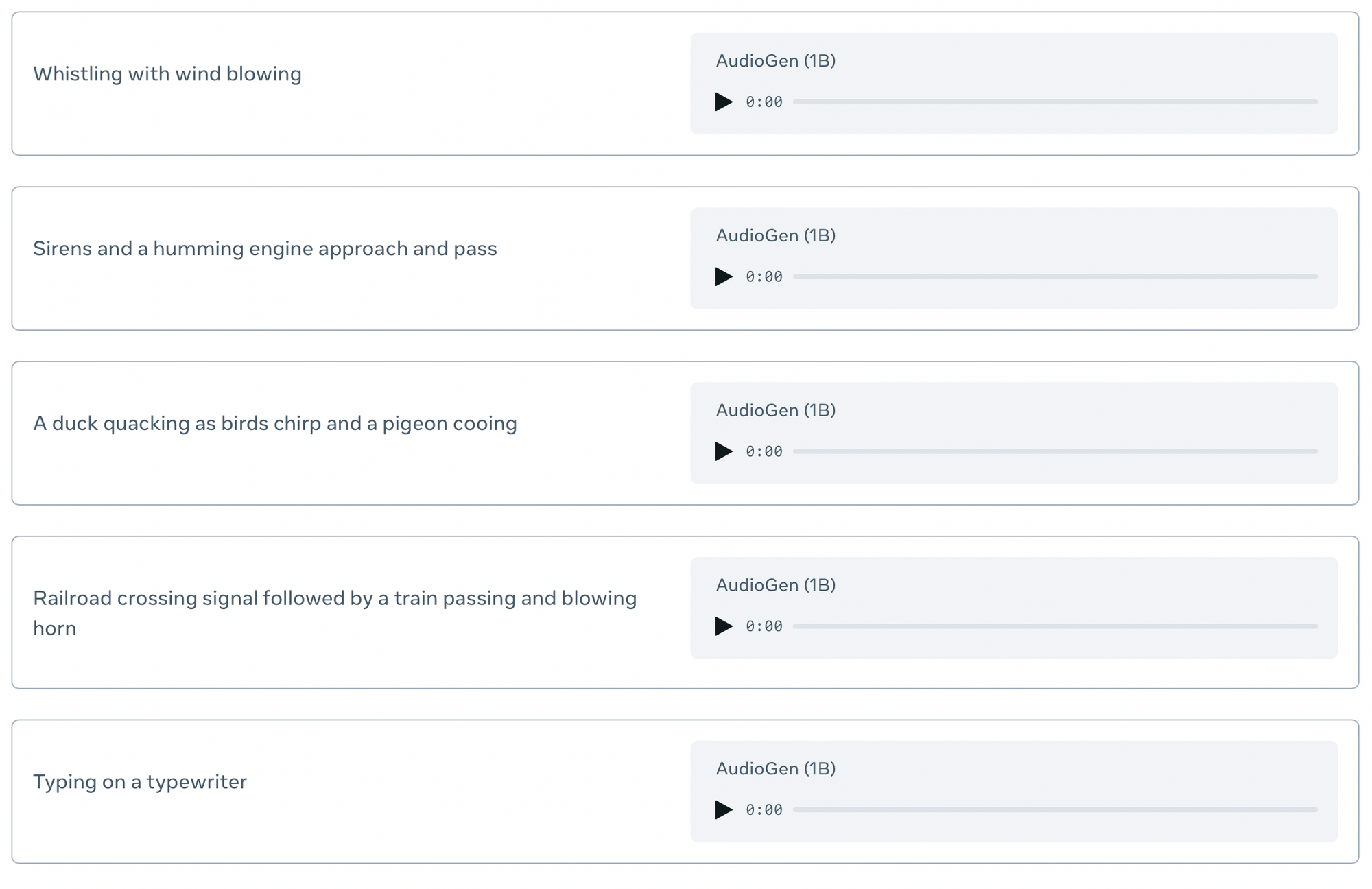 AudioGen — це авторегресивна модель мовної моделі від Meta, яка дозволяє генерувати звуки за текстовим описом, враховуючи опис акустичної сцени, настрій, жанр та інші аудіоефекти. Окрім музики, модель також може генерувати звуки навколишнього середовища, що відповідають реалістичними умовами запису та складним контекстам сцени. Для того, щоб згенерувати музику, впишіть підказку, на кшталт, “Railroad crossing signal followed by a train passing and blowing horn” та зачекайте 10 секунд, щоб отримати запис. Генерація відбувається у Discord.