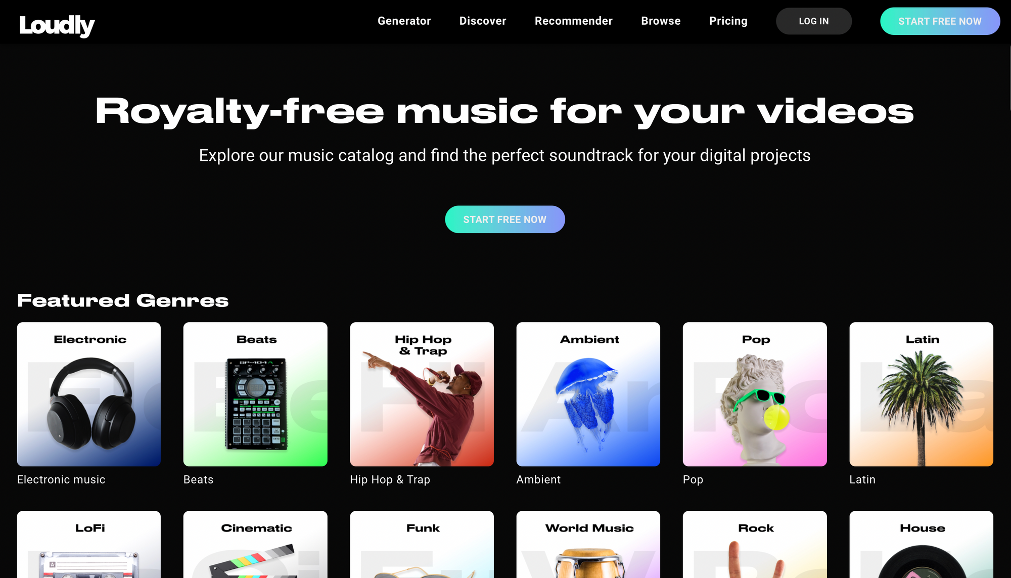 Loudly — інструмент для генерації музики, де кожен можете створити унікальну пісню, вказавши стиль, настрій і тривалість треку за допомогою текстової підказки. Окрім, ШІ Loudly також пропонує безкоштовну бібліотеку музики, яку можна вільно використовувати для різних проєктів та отримати ліцензію на саундтреки. Додатково є пошуковий інструмент AI Recommender, який пропонує музику на основі вашого смаку, а також готові плейлисти: для анімацій, YouTube відео, подкастів і навіть фільмів.