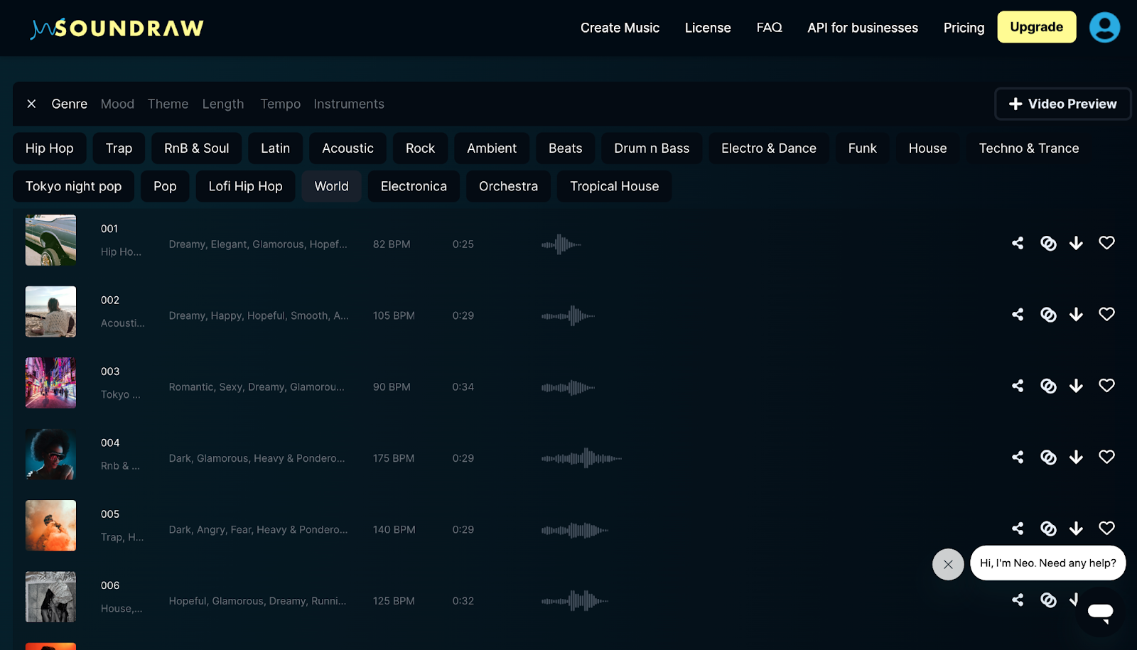Soundraw — інструмент для створення безкоштовної музики з використанням штучного інтелекту, який дозволяє створювати саундтреки для ваших відео, а ви своєю чергою можете редагувати їх за власними уподобанням. Для цього необхідно вибрати настрій, жанр і тривалість звуку, а решту за вас виконає ШІ. Безкоштовно можна завантажувати до 50 пісень щодня. Це можуть бути як готові звуки, завантажені з вбудованої бібліотеки, так і згенеровані за вашими параметрами треки.