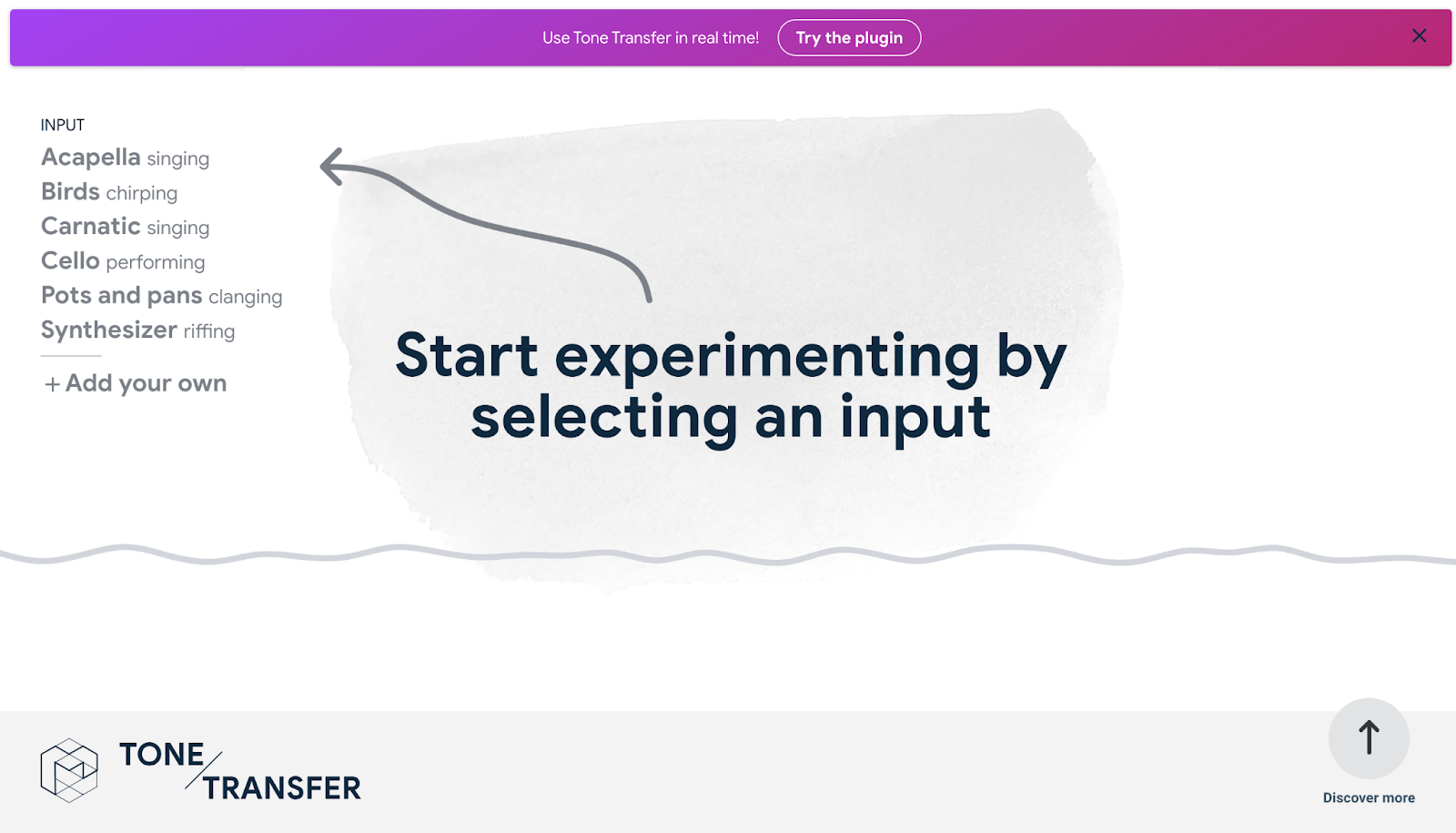 Google Tone Transfer — це музичний проєкт зі штучним інтелектом, розроблений Google і Magenta. Додаток дозволяє користувачам завантажувати аудіо одного голосу чи інструменту, а потім відтворювати його на іншому музичному інструменті, деконструюючи музичні звуки. Наприклад, взяти звук барабана і замінити його на скрипку.