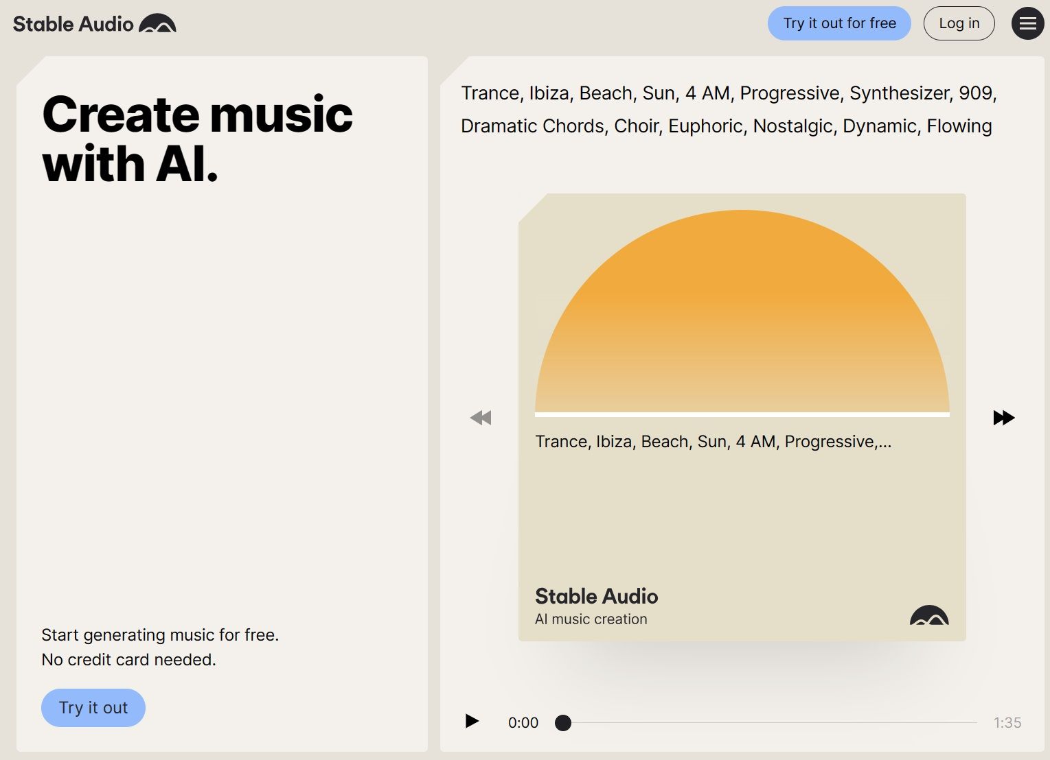 Stable Audio — це перший продукт Stability AI для створення музики та звукових ефектів. Платформа з дуже естетичним інтерфейсом, де користувачі можуть створювати оригінальне аудіо на основі текстової підказки, генеруючи аудіо у високоякісному 44,1 кГц стереозвуку. Не забудьте вказати необхідну тривалість звуку! Інструмент працює на основі латентної дифузії для аудіомоделі, навченої на основі даних провідної музичної бібліотеки AudioSparx.