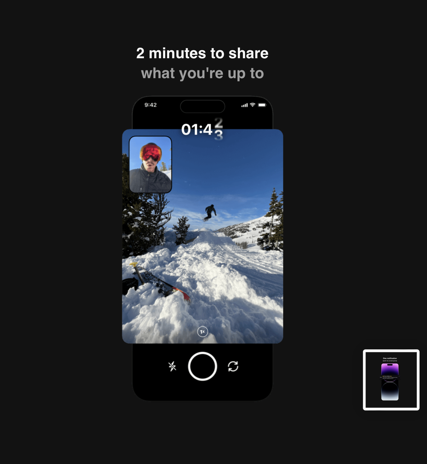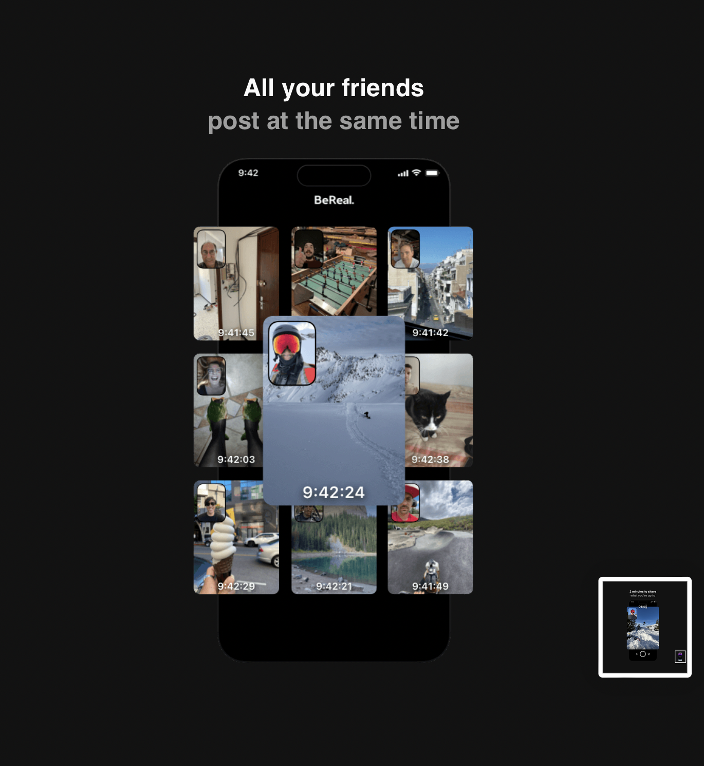 BeReal – це програма для обміну фотографіями, яка дозволяє користувачам публікувати одну фотографію на день, щоб показати своїм підписникам, що вони роблять у реальному часі. Додаток BeReal тримає фокус на автентичності та просить користувачів бути справжніми. Оскільки додаток дозволяє кожному публікувати публікації лише раз на день, користувачі можуть не працювати в додатку кілька годин протягом дня, що робить додаток унікальним серед платформ соціальних мереж, які зараз домінують у просторі.