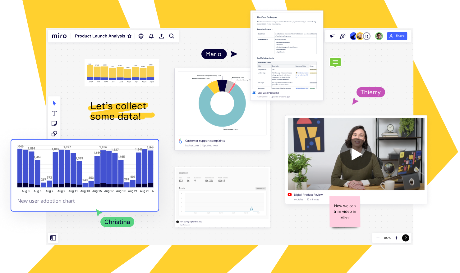 Miro Teams Workspace дозволяє командам співпрацювати в режимі реального часу, незалежно від місця чи часового поясу. Він має потужну пошукову систему, яка допоможе швидко знаходити документи та ресурси, а також інтерфейс перетягування, який дозволяє користувачам швидко додавати ресурси до своїх проєктів. У Miro також є велика бібліотека шаблонів, зображень і піктограм для налаштування проєктів.