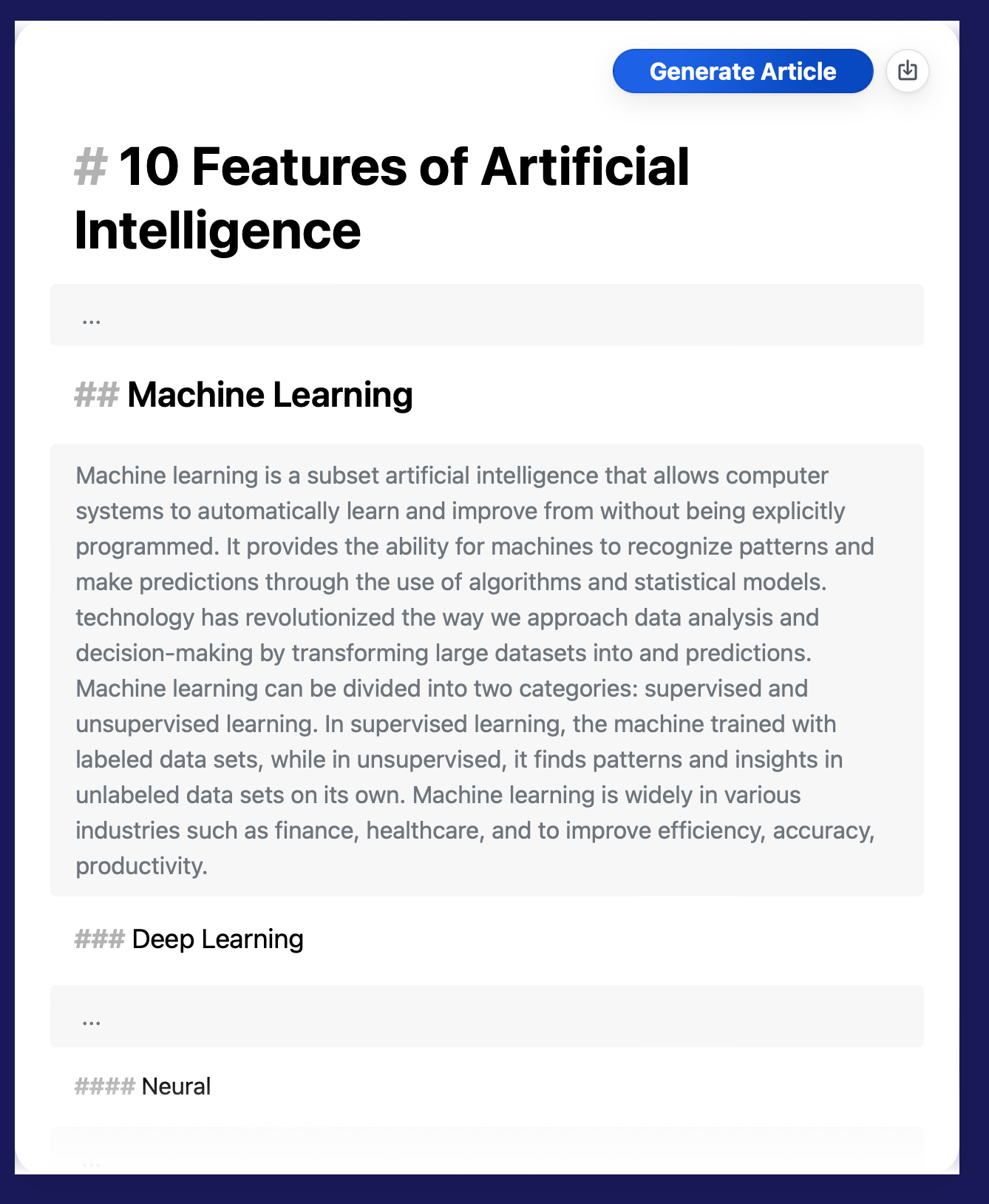 Коли ви вже задоволені тим, як виглядає та що містить ваша інтелект-карта, ви можете згенерувати статтю або опис карти, використовуючи її інтелект-карту як основу. Для цього просто перейдіть до текстової версії вашої інтелект-карти, там ви побачите кнопку "створити статтю". Натиснувши, ChatGPT почне генерувати текст до кожного розділу по черзі. Це може зайняти близько 5 хвилин.